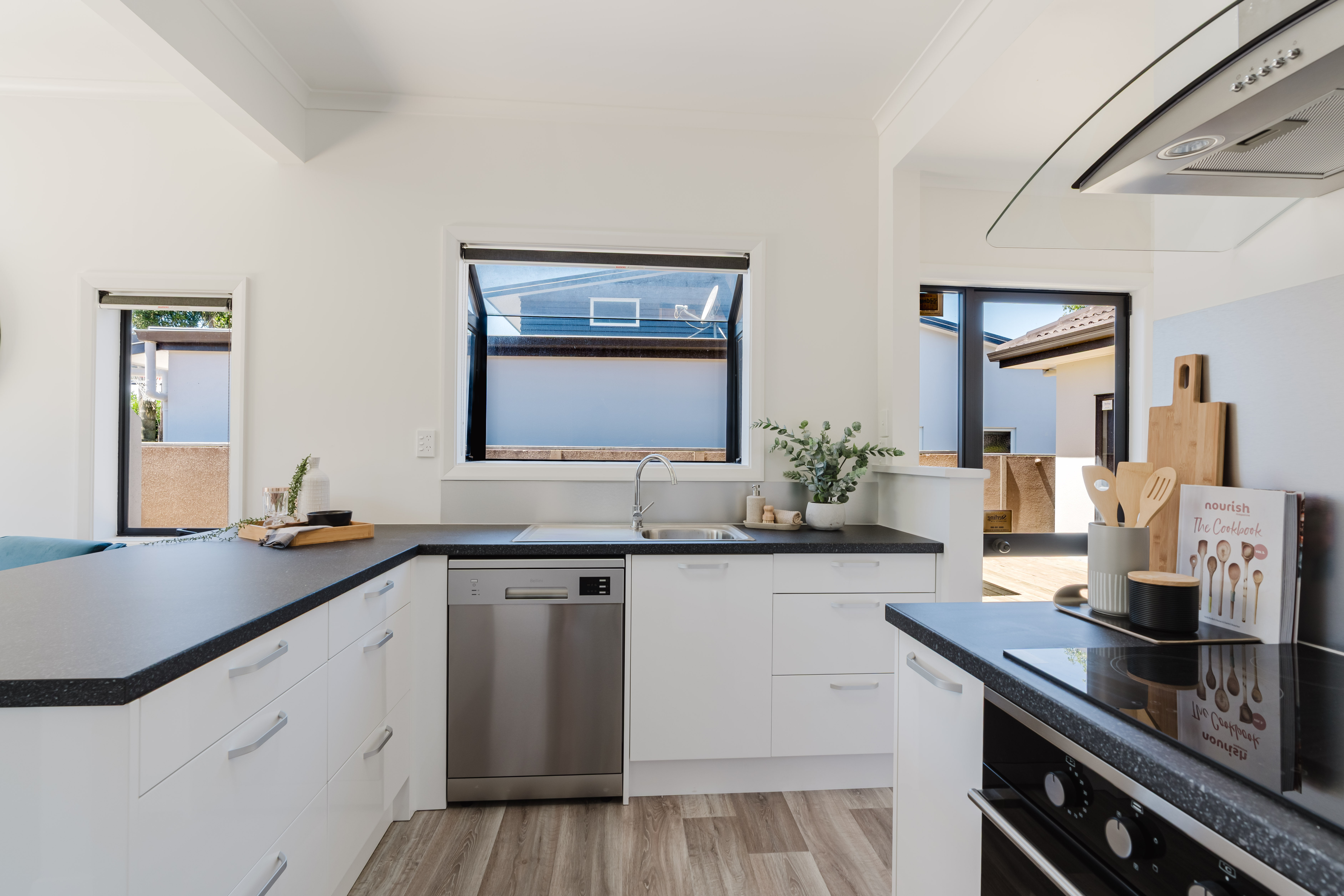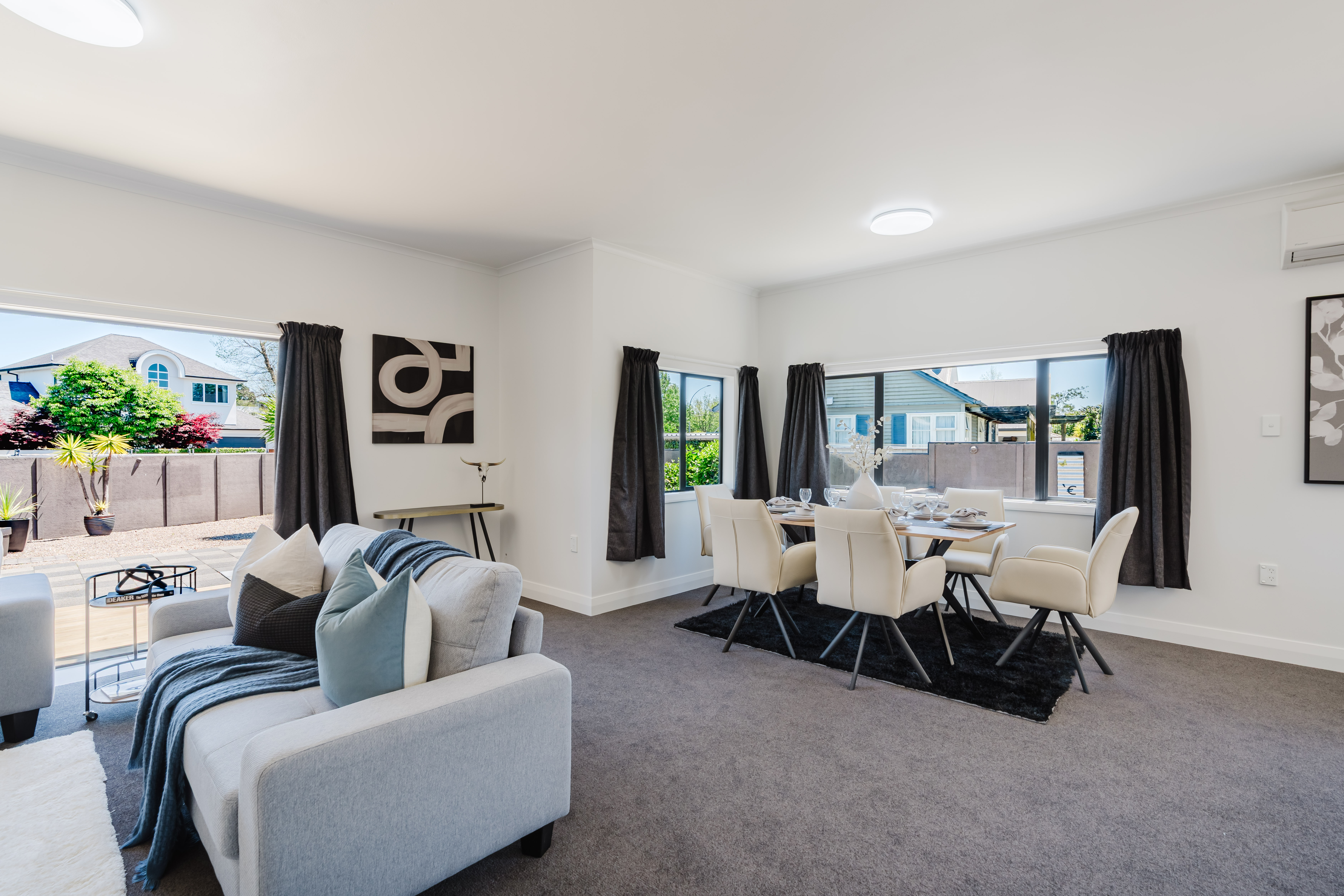 The spacious living areas feature a combined lounge and dining room that flows seamlessly into a modern kitchen, perfect for entertaining with high-quality appliances, including a cooktop, wall oven, and dishwasher.