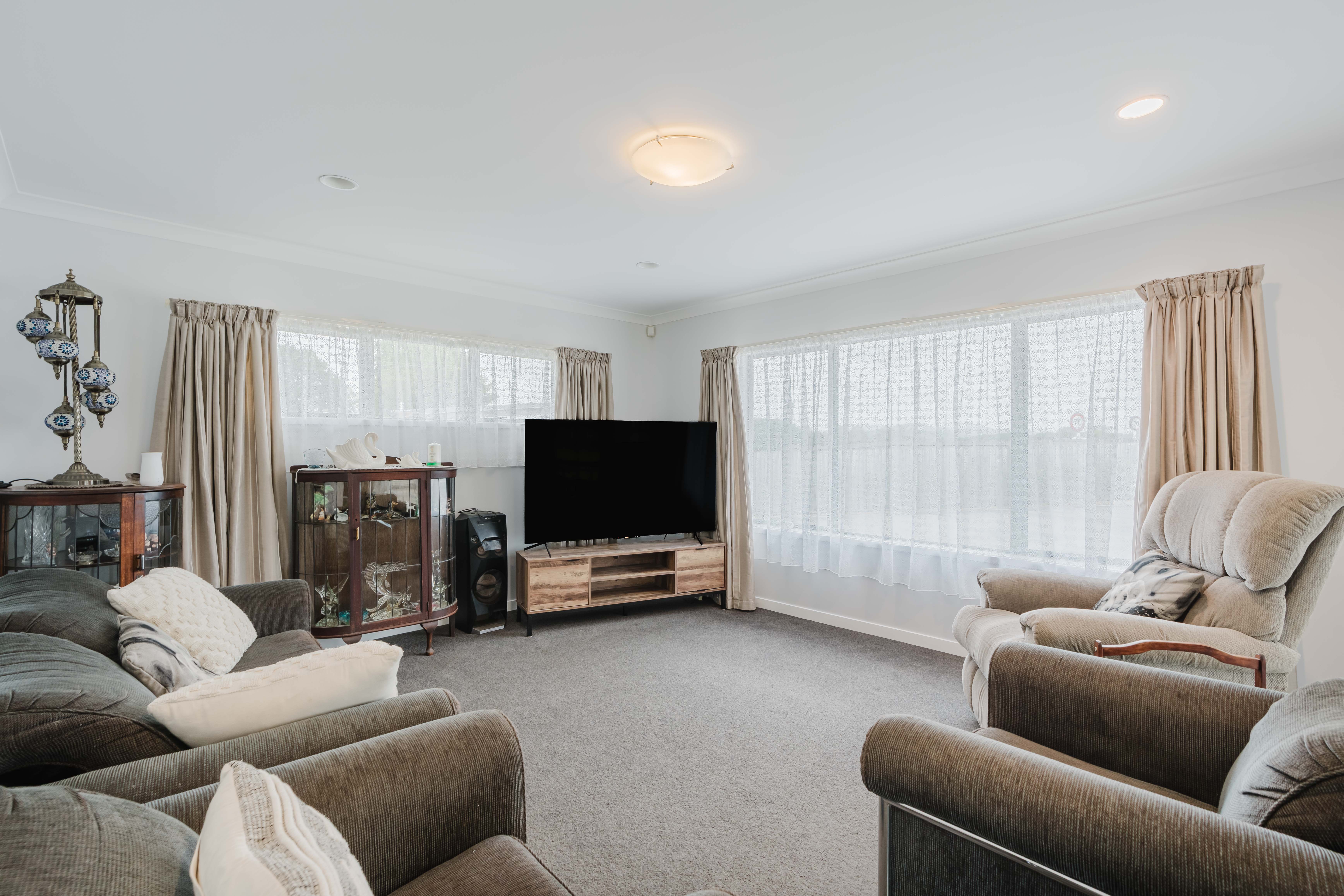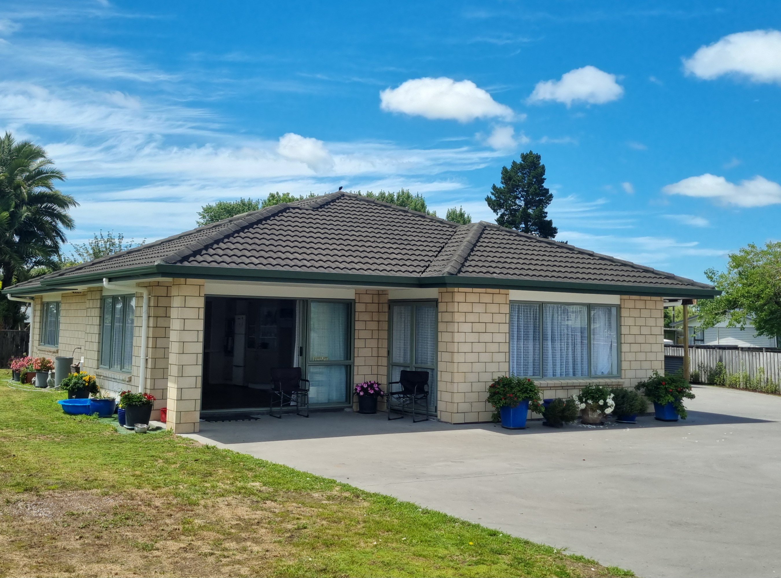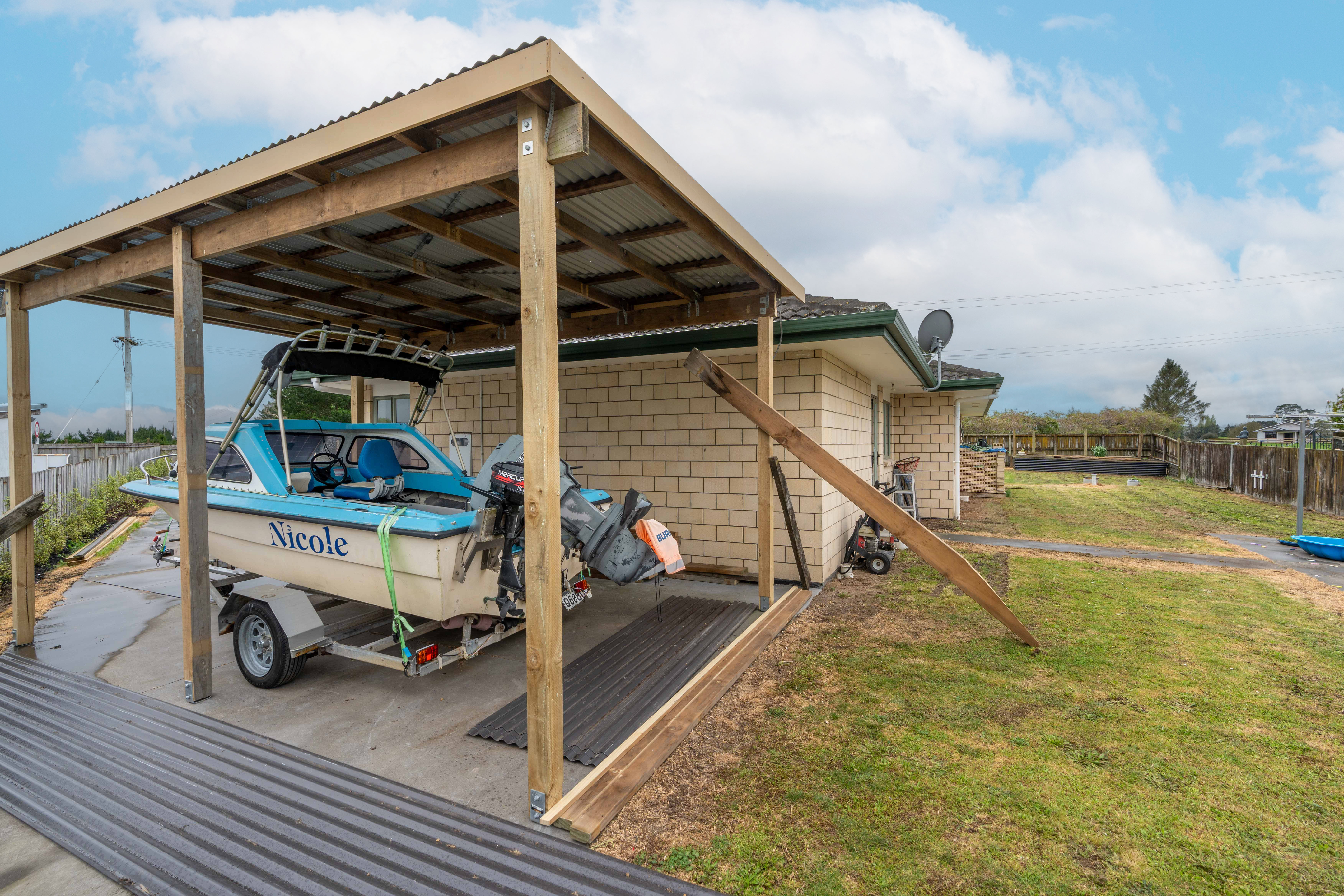 Easy care brick cladding and aluminium joinery with a generous concrete driveway for parking, a double garage AND a high carport for your boat or caravan or motorhome. The large section is just waiting for your green fingers.