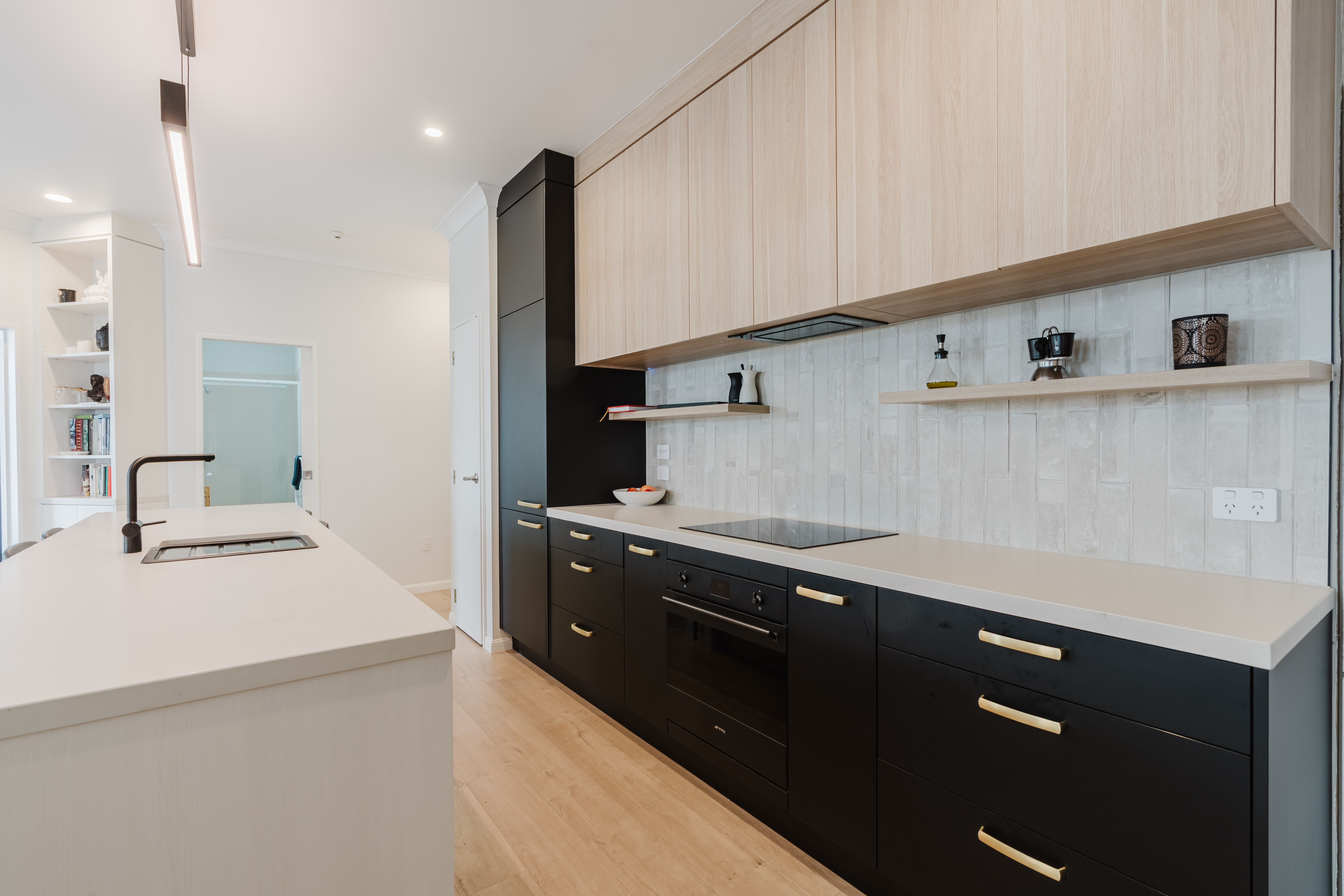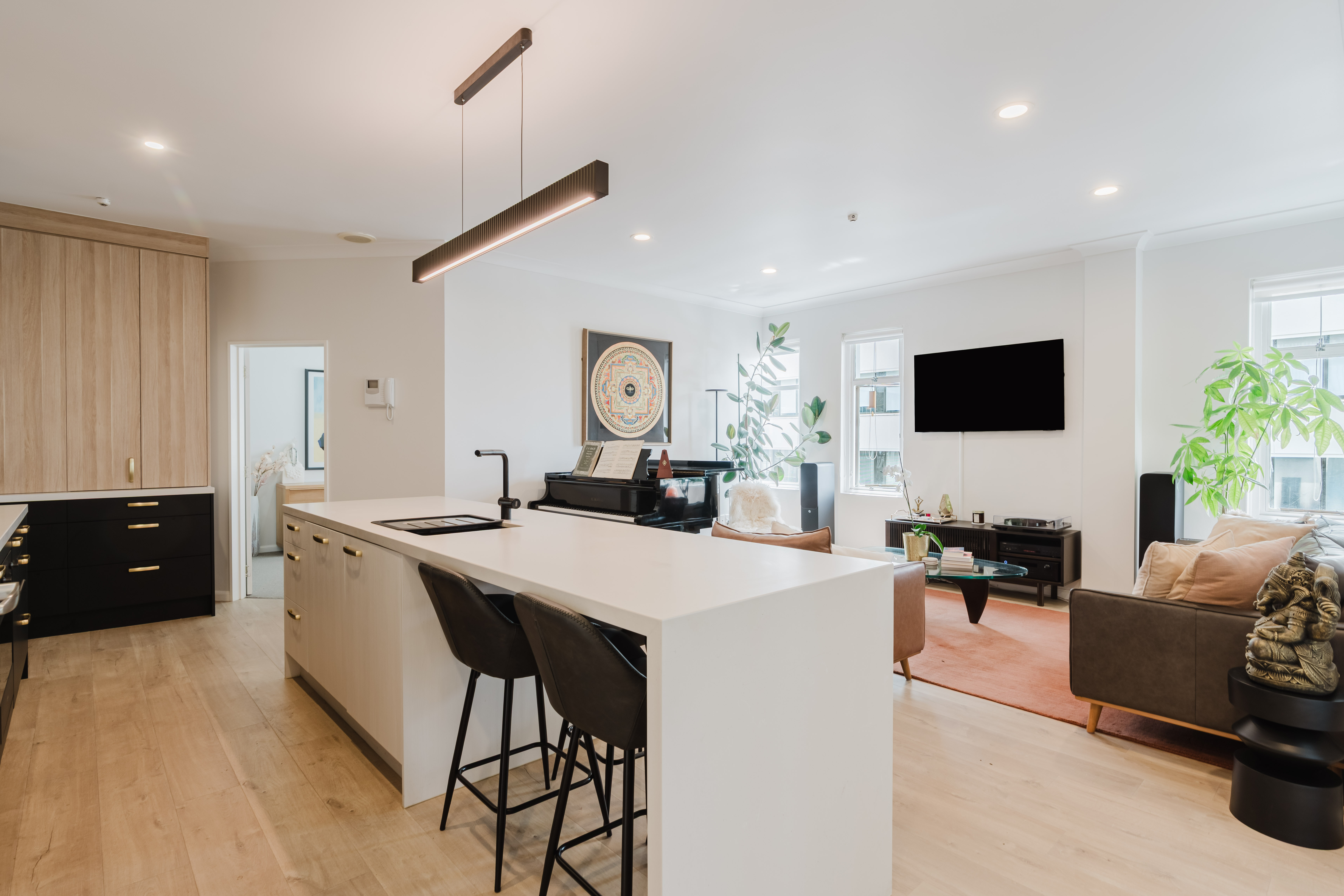 Fresh, light and breezy interiors are complemented by industrial-style windows with remote blinds, flooding the apartment with natural light. The designer kitchen is undoubtedly the showstopper, boasting floor-to-ceiling cabinetry that seamlessly bridges old-world charm with modern sophistication.