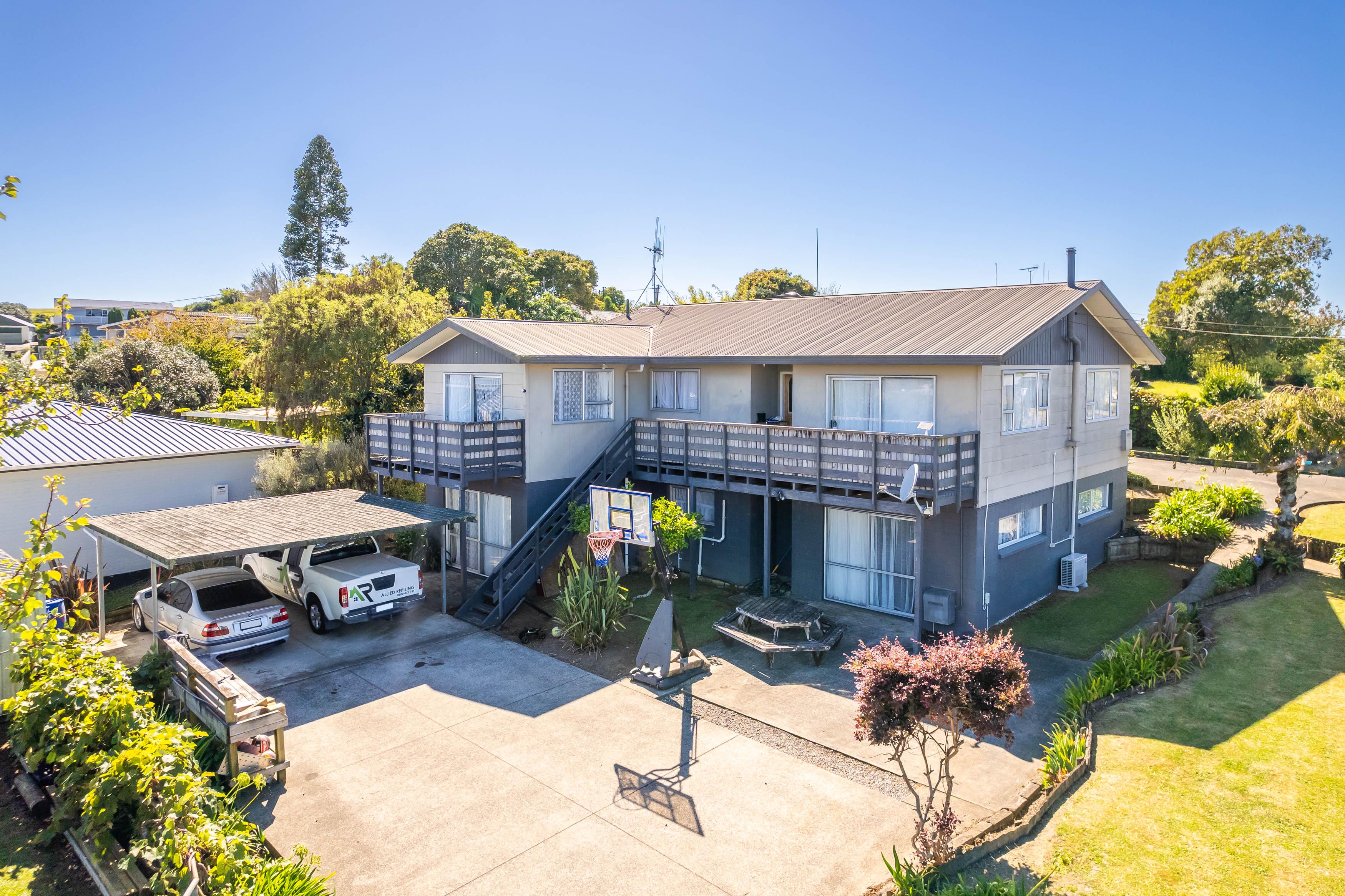 This two-level home offers far more than first meets the eye. The upper level features generous open-plan living that flows seamlessly to decks on both sides of the home. From the front deck, take in sweeping Pirongia views, while the rear deck captures stunning outlooks toward the Temple. The kitchen provides excellent bench space and connects effortlessly with the dining and lounge areas.