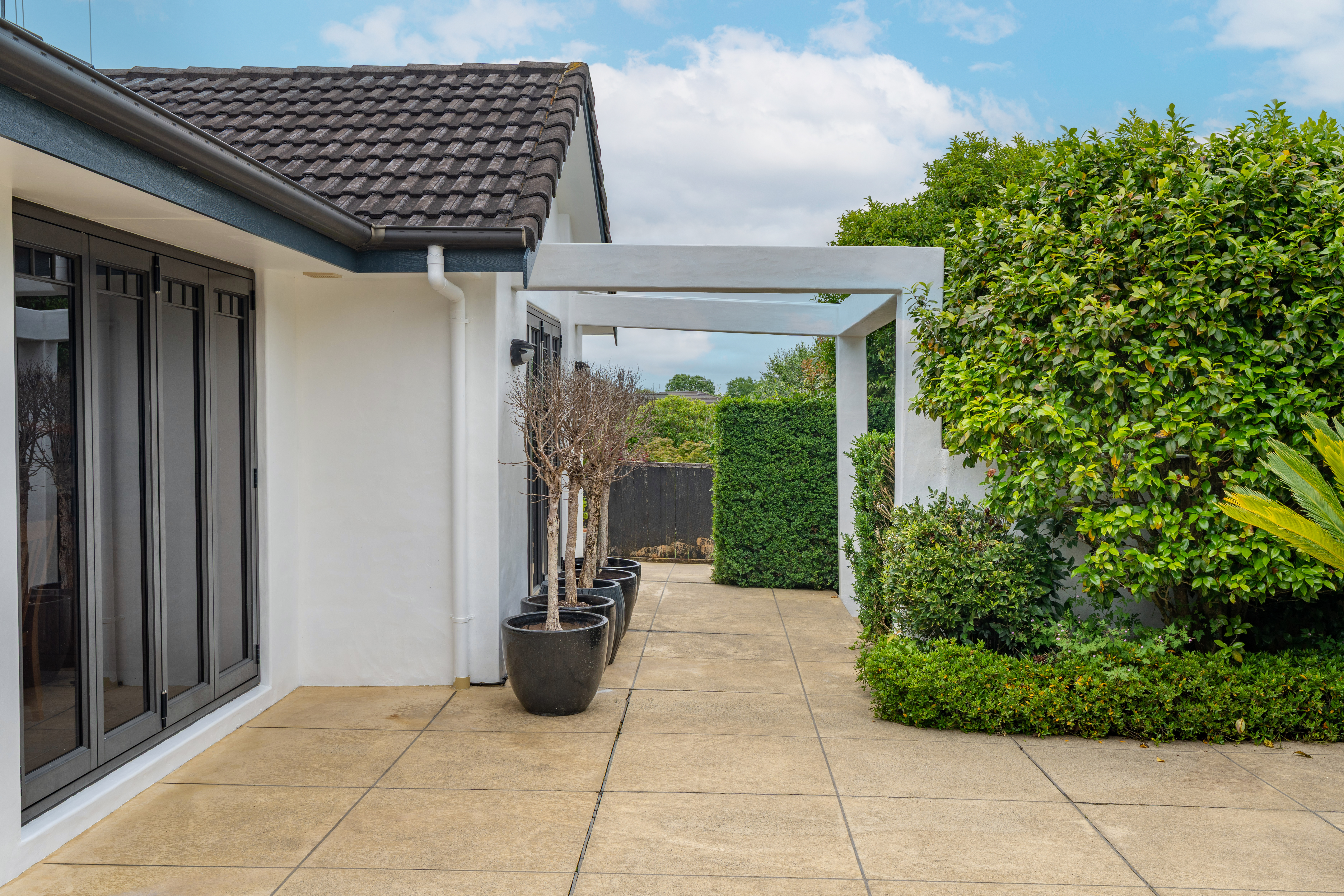 The home is constructed with solid plaster-over-brick cladding that has been recently repainted.