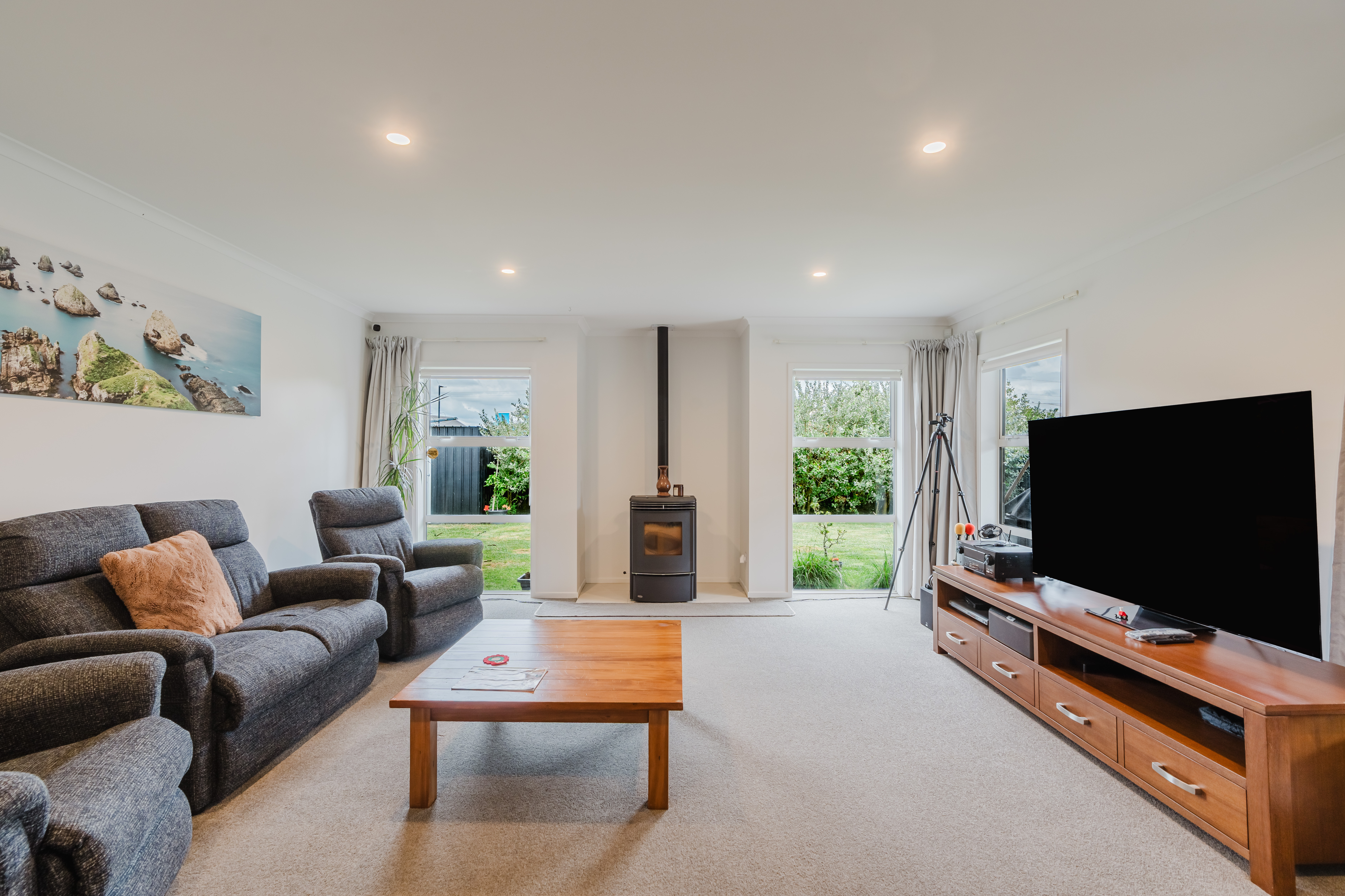 At the heart of the home is a modern, well-designed kitchen featuring a rangehood, wall oven, cooktop, and waste disposal unit. The open plan dining and living areas flow seamlessly together, creating a warm and inviting space for everyday family life and entertaining. A pellet heater in the main downstairs living area adds both ambience and efficient warmth, complemented by heat pumps and ceiling fans for year-round comfort. Gas hot water ensures efficiency and reliability.