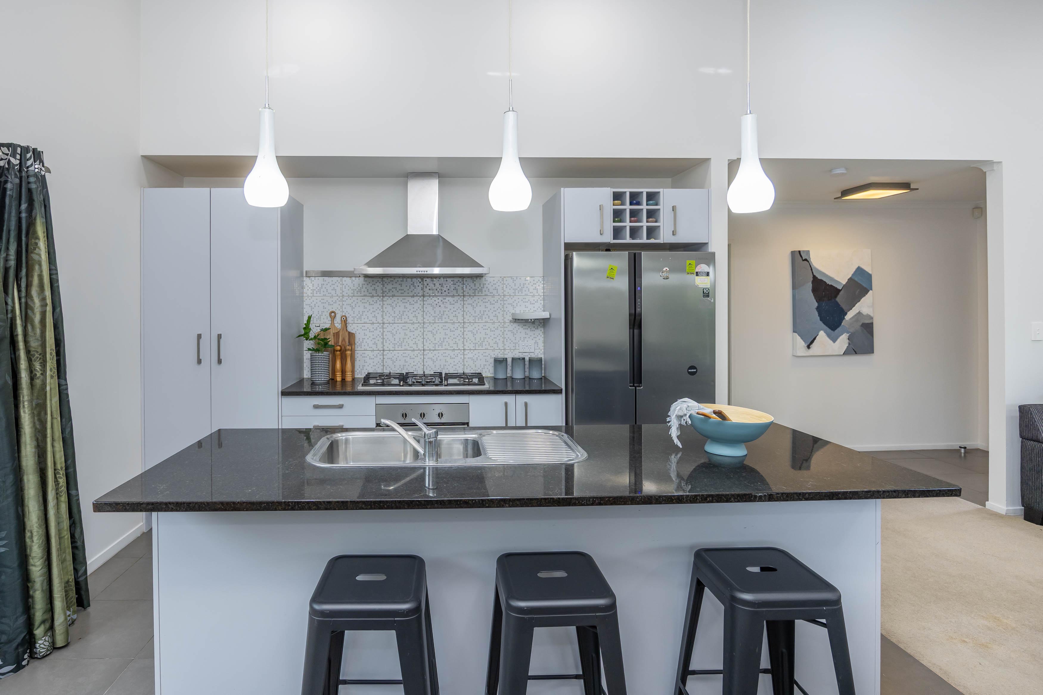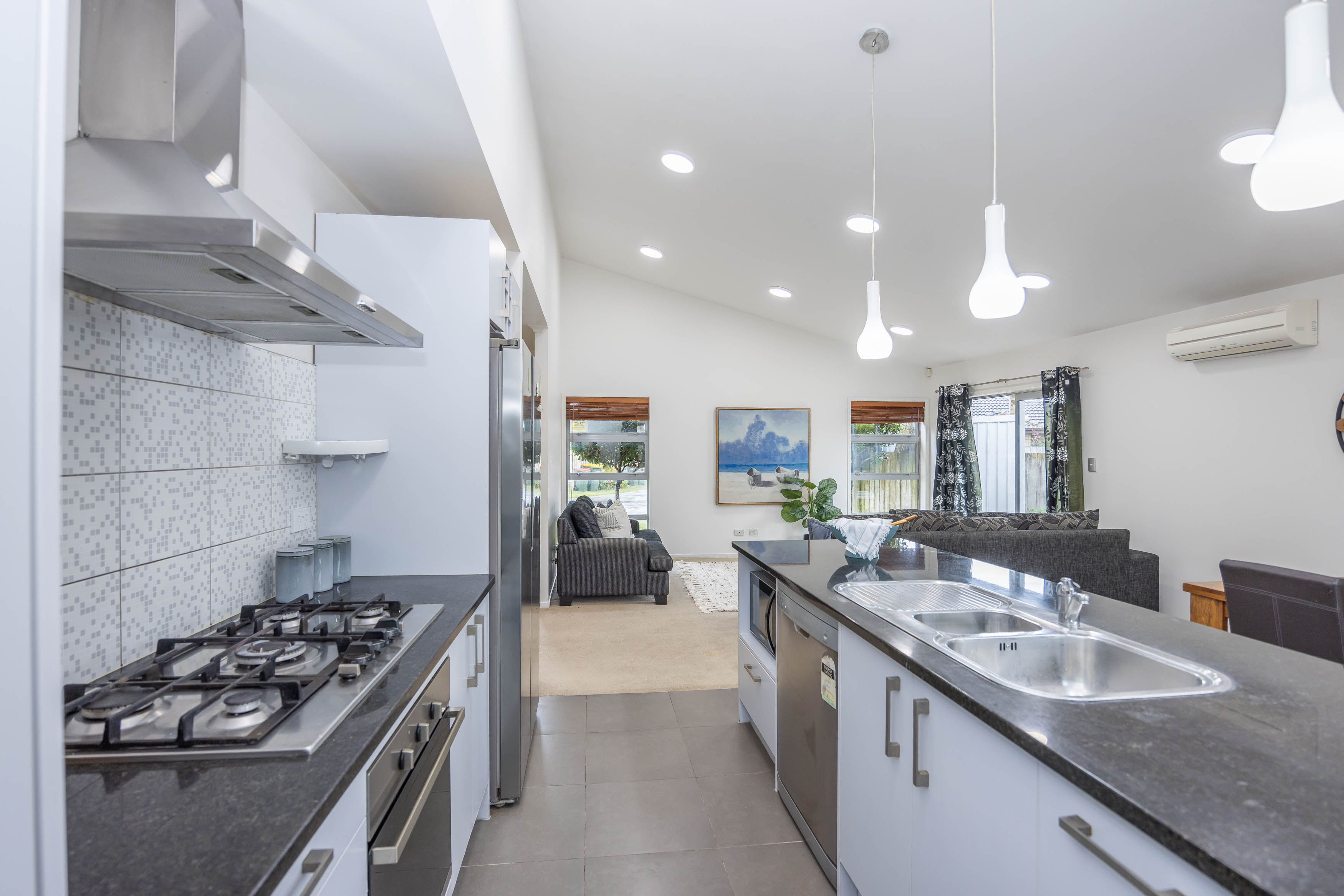 The open plan kitchen, dining and living area is light-filled and practical, featuring stone benchtops, gas cooking and generous bench space. It's a layout that handles busy weekday routines just as easily as weekend catch-ups with friends. A heat pump ensures year-round comfort, while the double internal-access garage adds everyday ease.