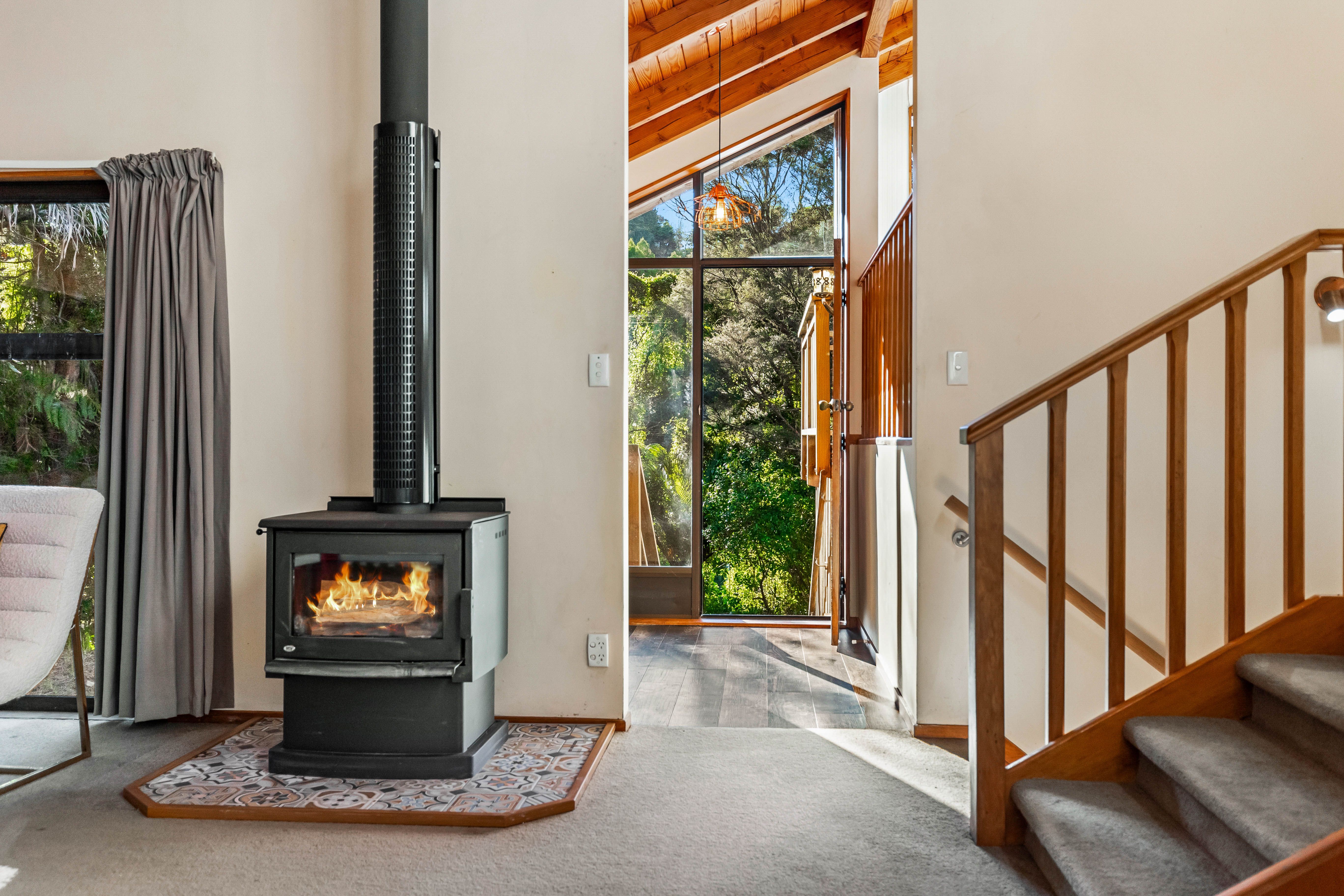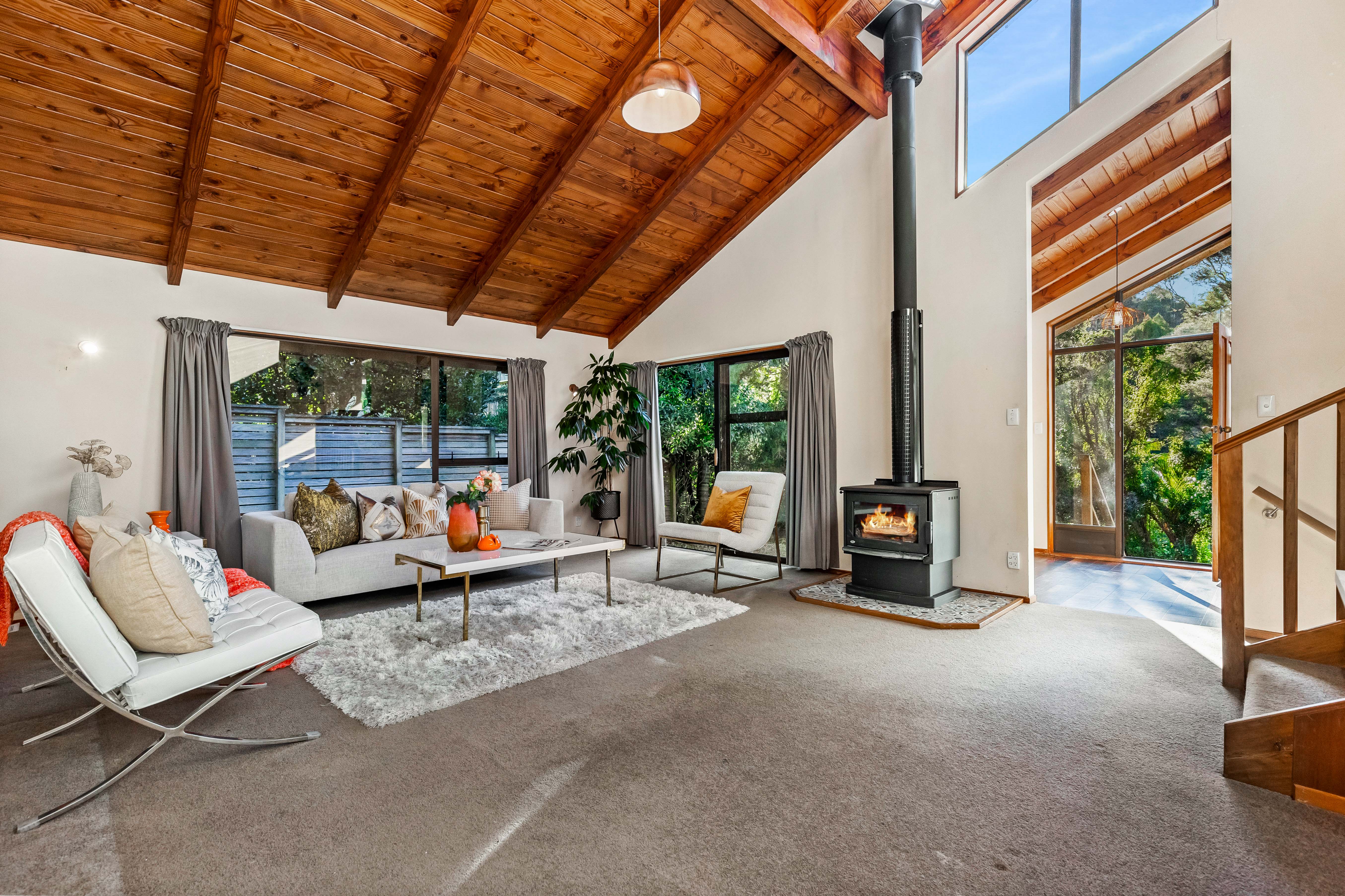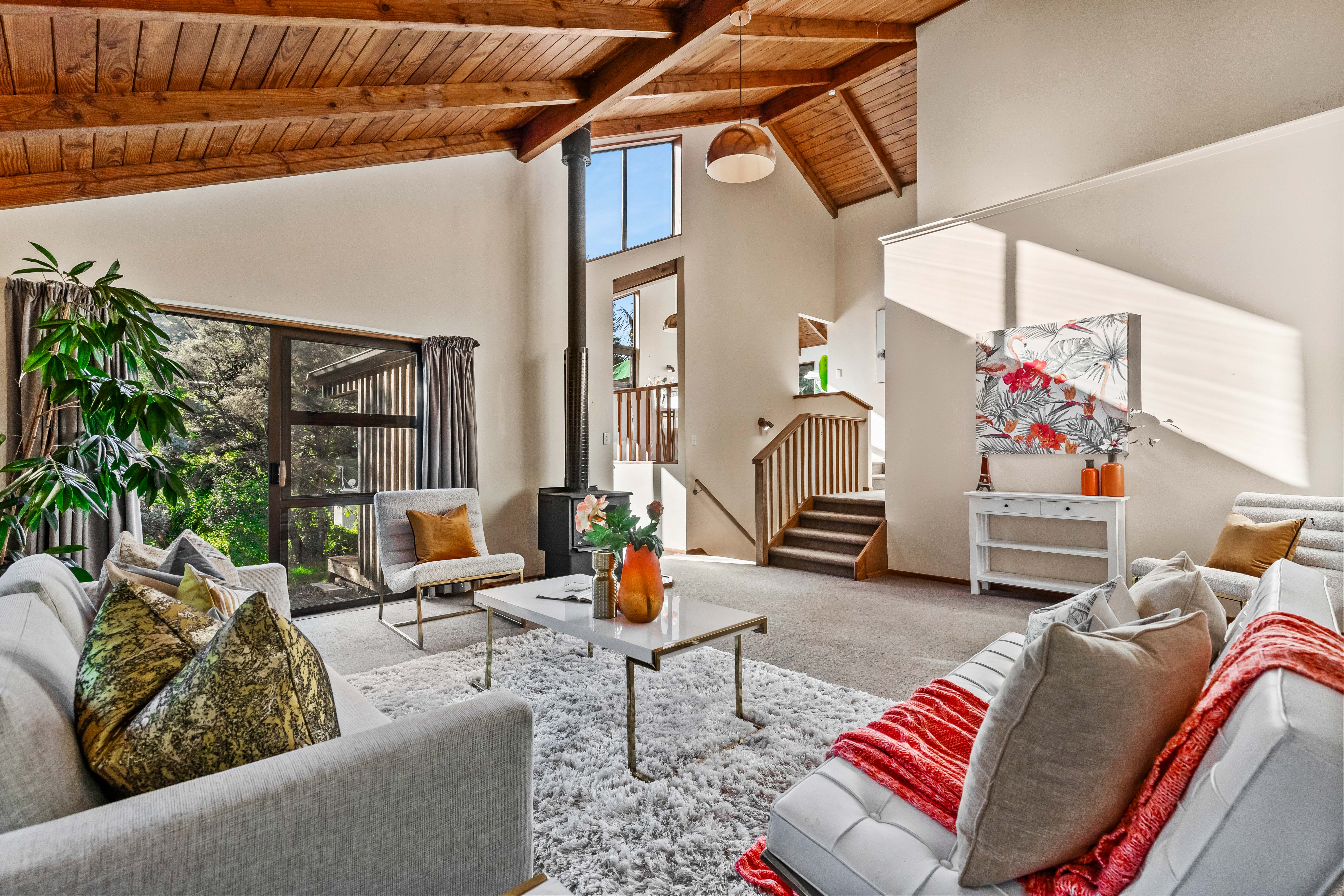This is a location where property is tightly held and it's not hard to see why when you consider the natural aesthetics, 'sought-after' education options, ease of access, and proximity to outdoor pursuits/activities that are well-known by the locals for entertaining the whole family. Popular fishing spots, beaches (including an off leash for dogs), kilometres of walking/hiking tracks, parks, picnic areas, and even a tennis court are at your disposal here 365 days. The home, an eighties design, is striking in looks and nicely positioned away from the road in a private and peaceful setting with no neighbours to speak of, unless you count the Kererus, Tuis and other native bird life that is ... Stepped over three-levels, it comprises varying timber ceiling heights, extensive use of glass, spaciousness, great separation, and a Titirangi vibe. A sweeping deck off the kitchen-dining space is a stand-out feature that adds volume to the home and suggests 'Entertaining' is par for the course here. The double internal entry garage plus off-street parking for a boat or trailer is another plus ... as is the 1,113m2 land (can be maintained in between enjoying the leisurely pursuits mentioned above). Laingholm beach, the local Dairy, and a children's playground are all within an easy stroll of the home and provide convenient places for community members to connect ...