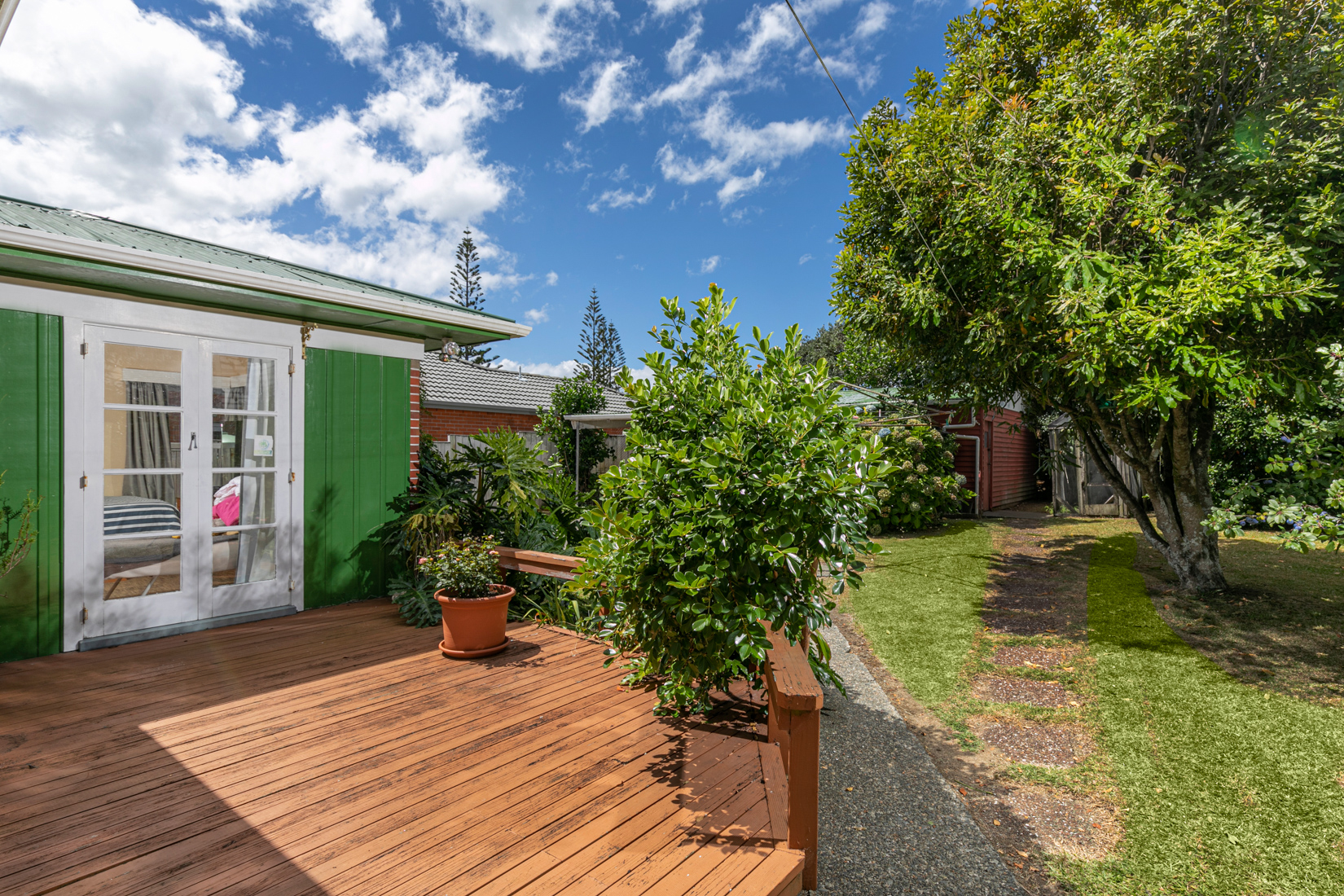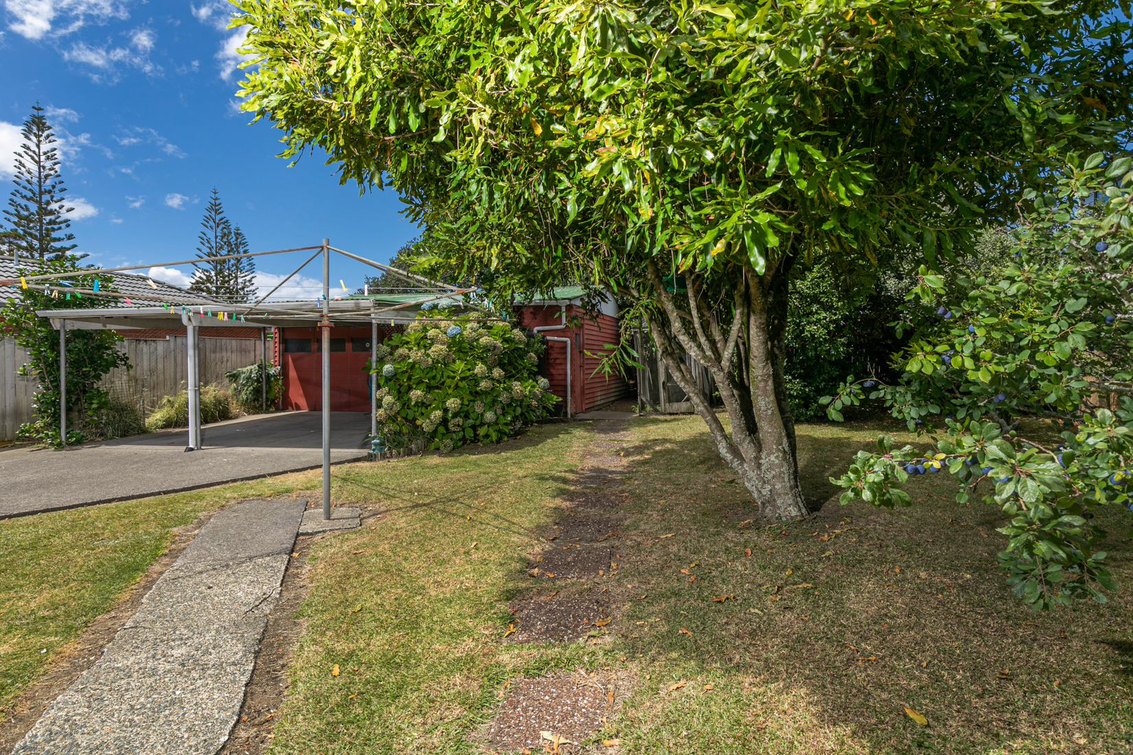 The backyard has established fruit trees and privacy, but for those looking for extra storage, there is double garaging with workshop space plus a covered carport.