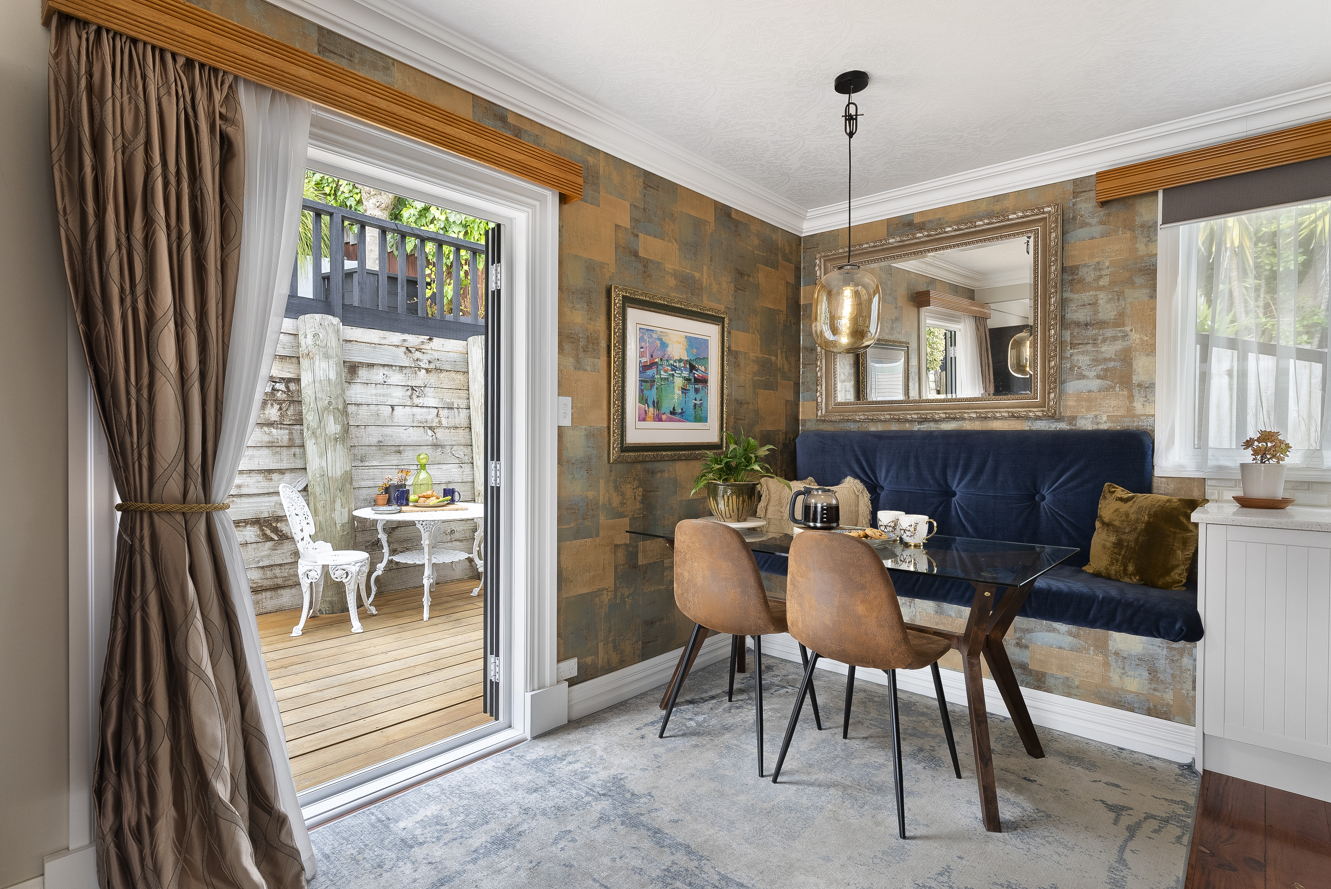 French doors open to the rear deck and bi-folds opening from the front deck to the open plan living area, with the dining boasting banquette seating and a stunning gourmet kitchen with plenty of bench space and large cooker.