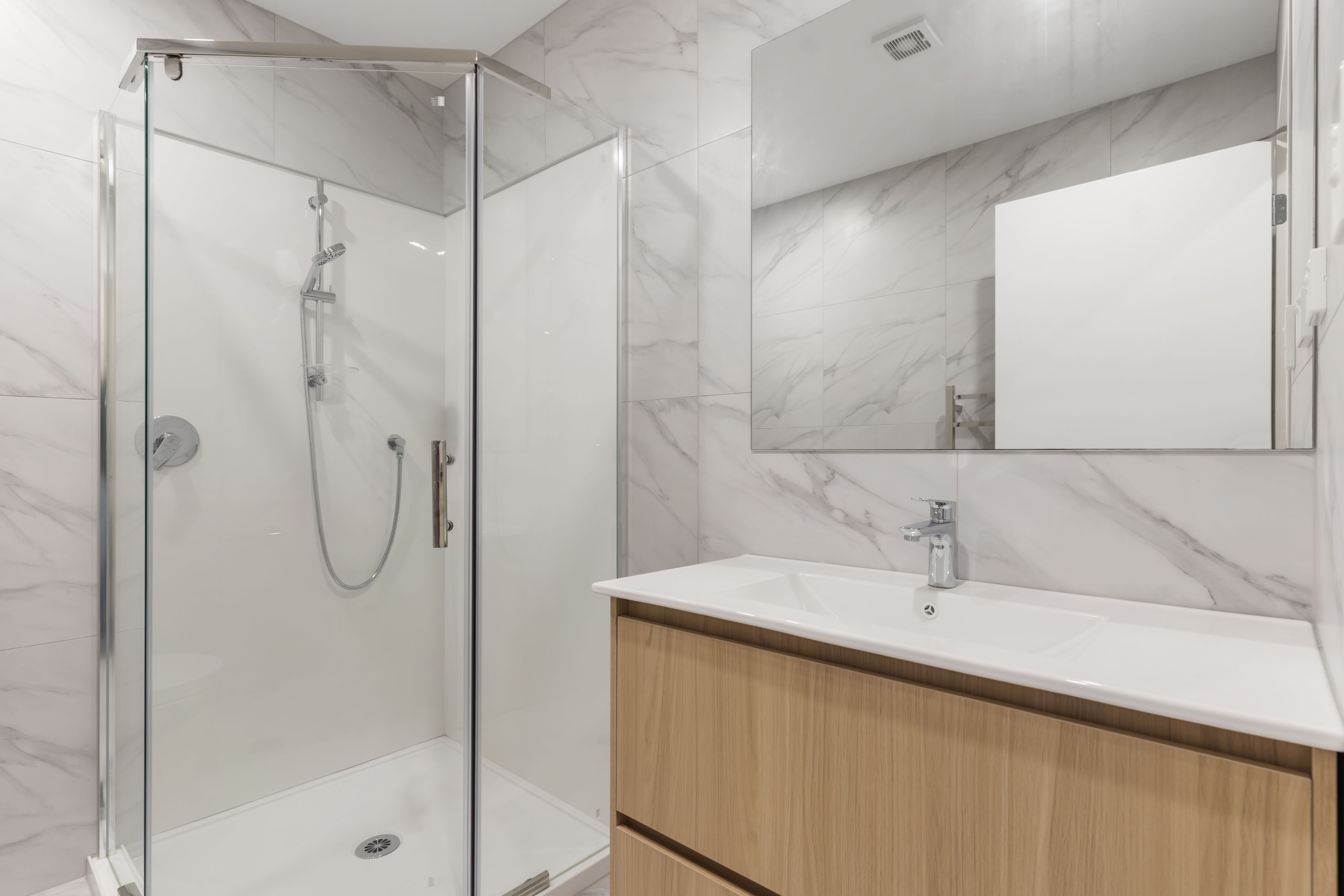 On the ground floor, you will find the first bedroom which boasts a spacious wardrobe, bathroom and laundry combined featuring Carrara marble style floor to ceiling tiles.