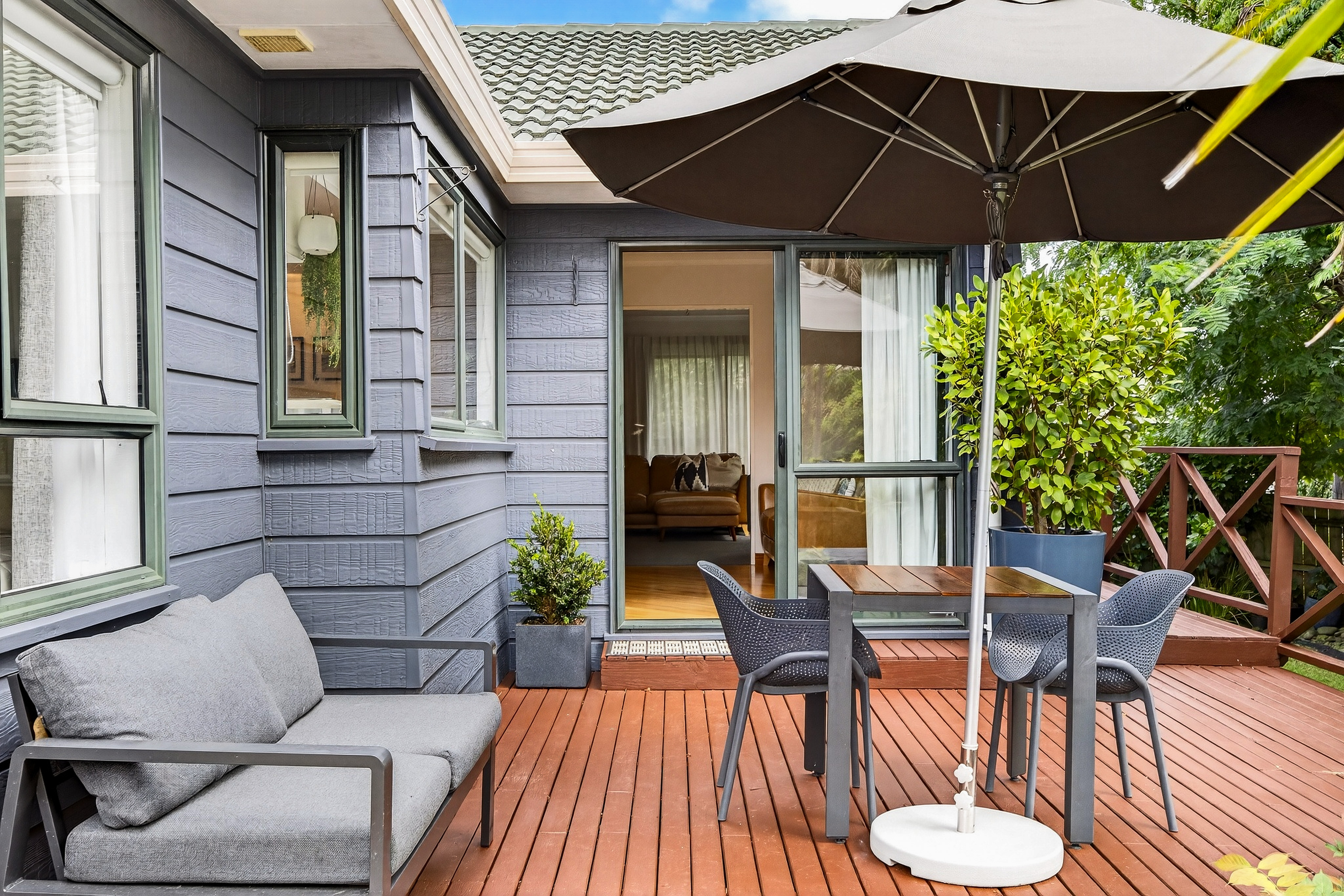 From here, the home opens into a large, light-filled living room designed for real relaxation. It flows seamlessly out to wrap-around decks and a substantial patio, creating multiple options for outdoor dining and entertaining.