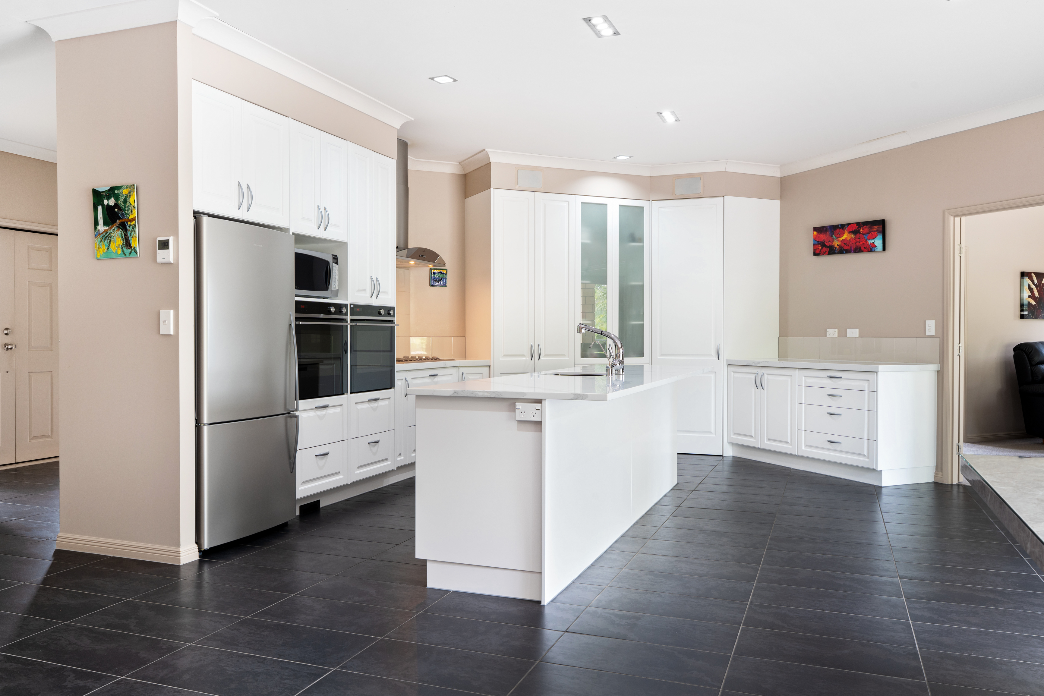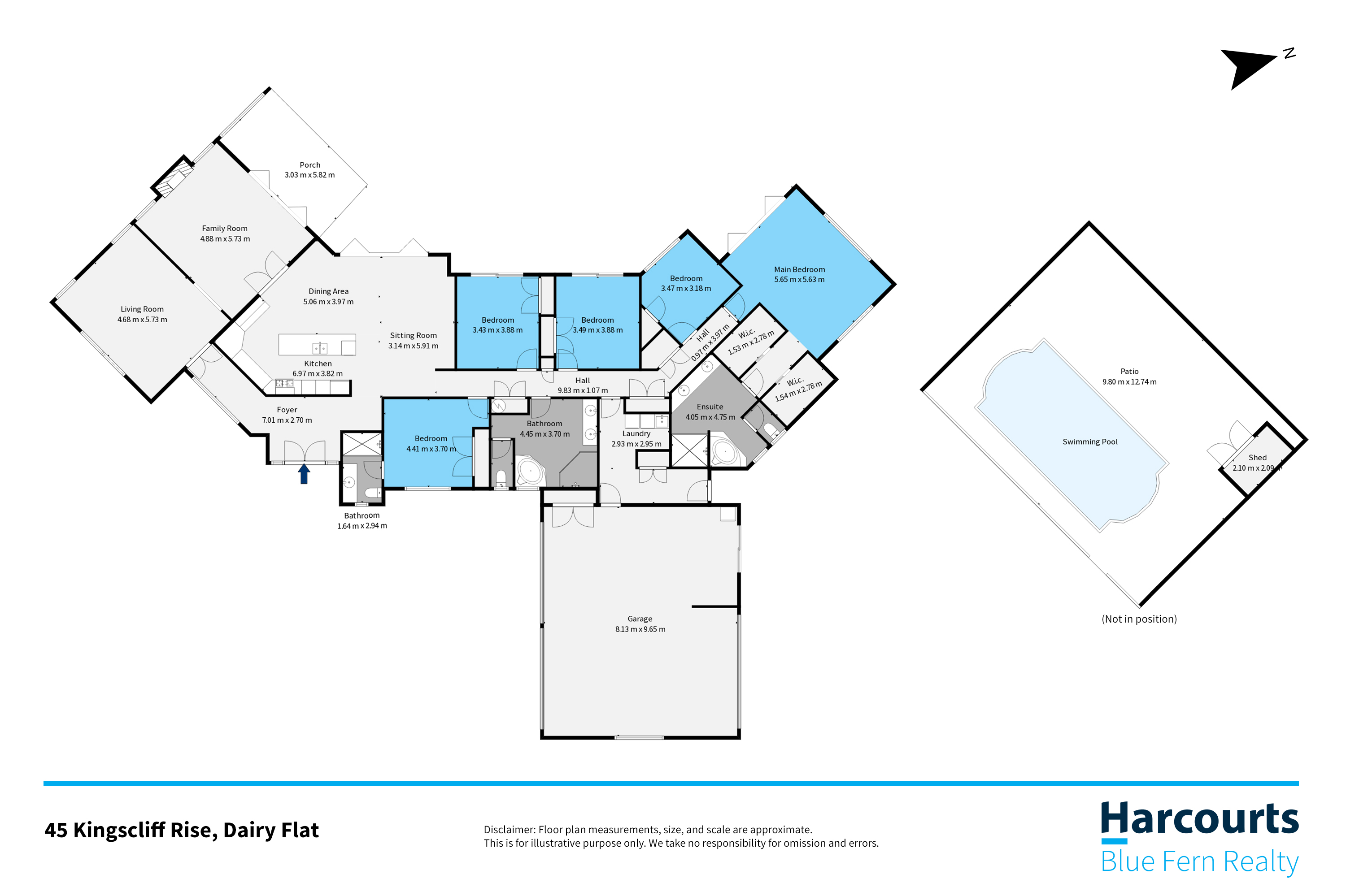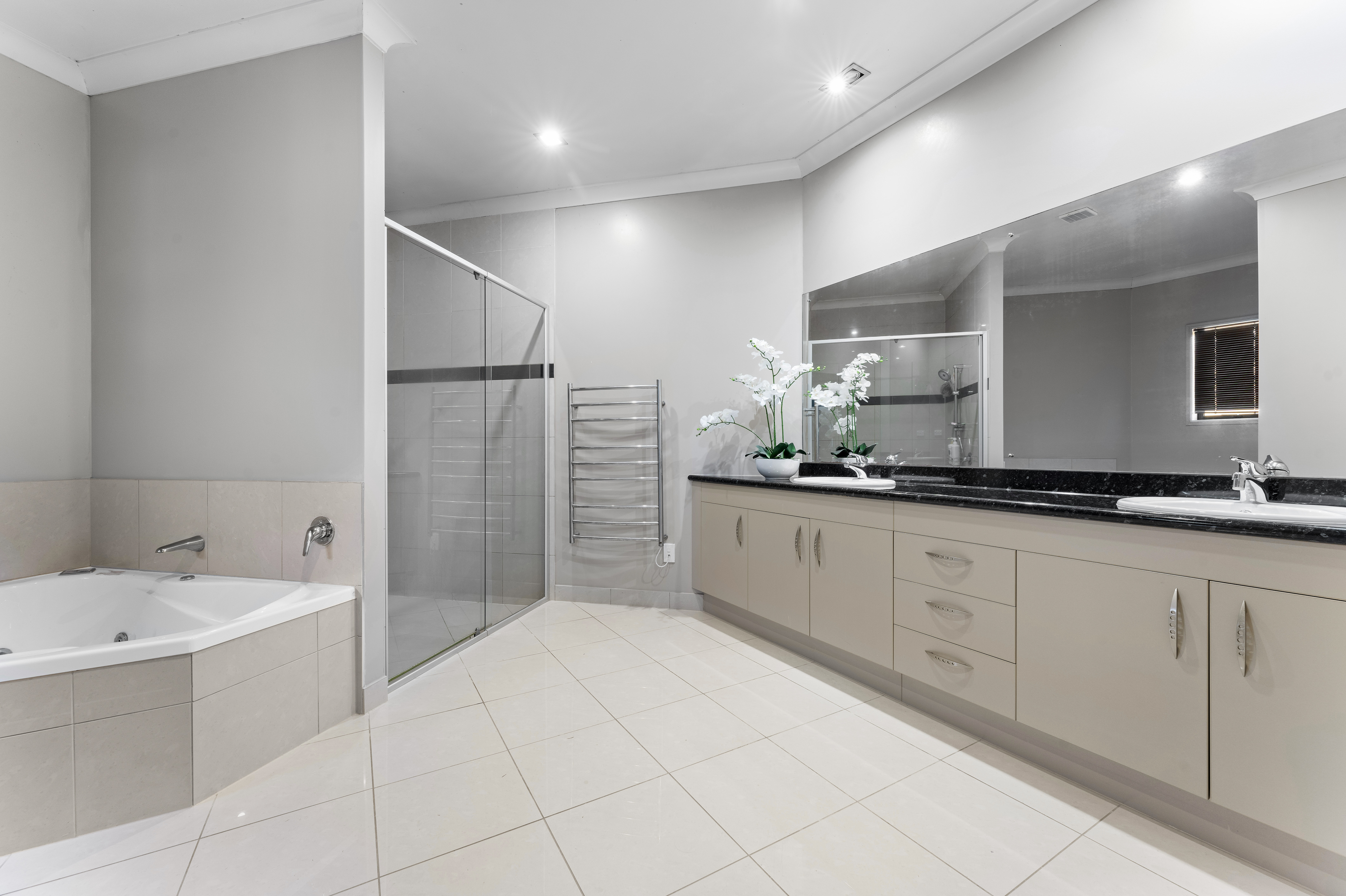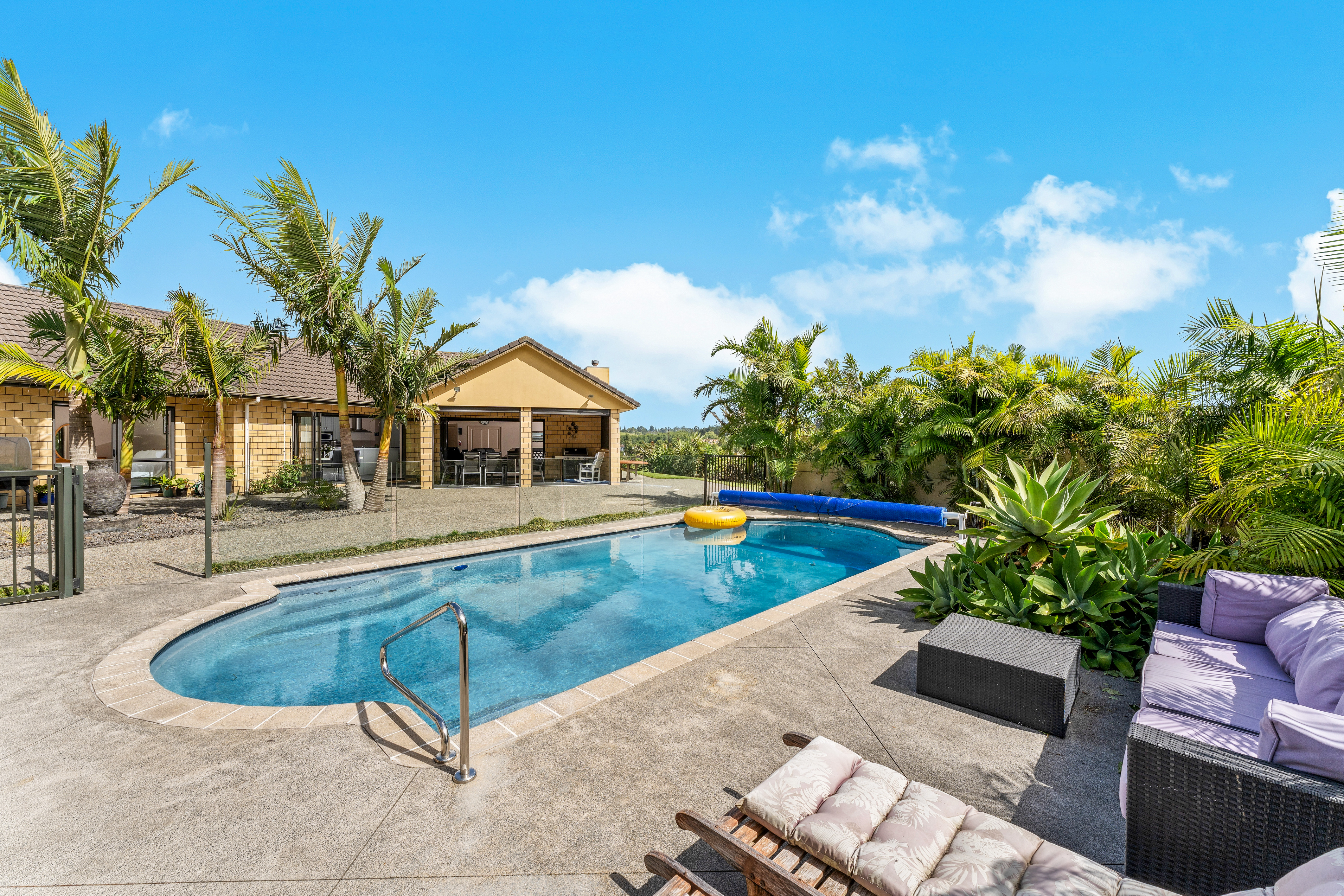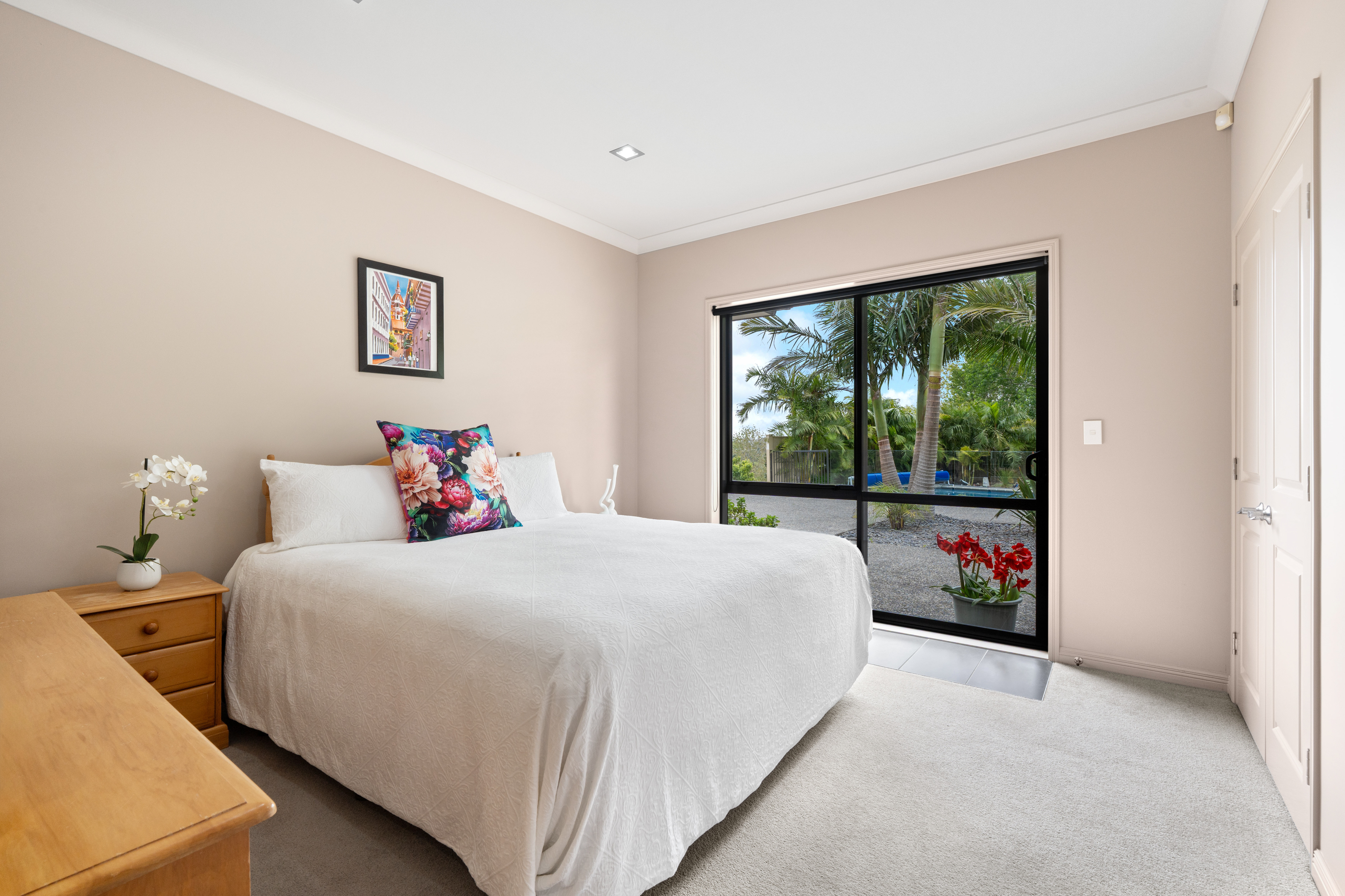 The private master wing boasts direct pool access, dual walk-in robes, and a spa ensuite. Perfect for guests, a second master features its own ensuite, plus there are three more double bedrooms and a family bathroom.