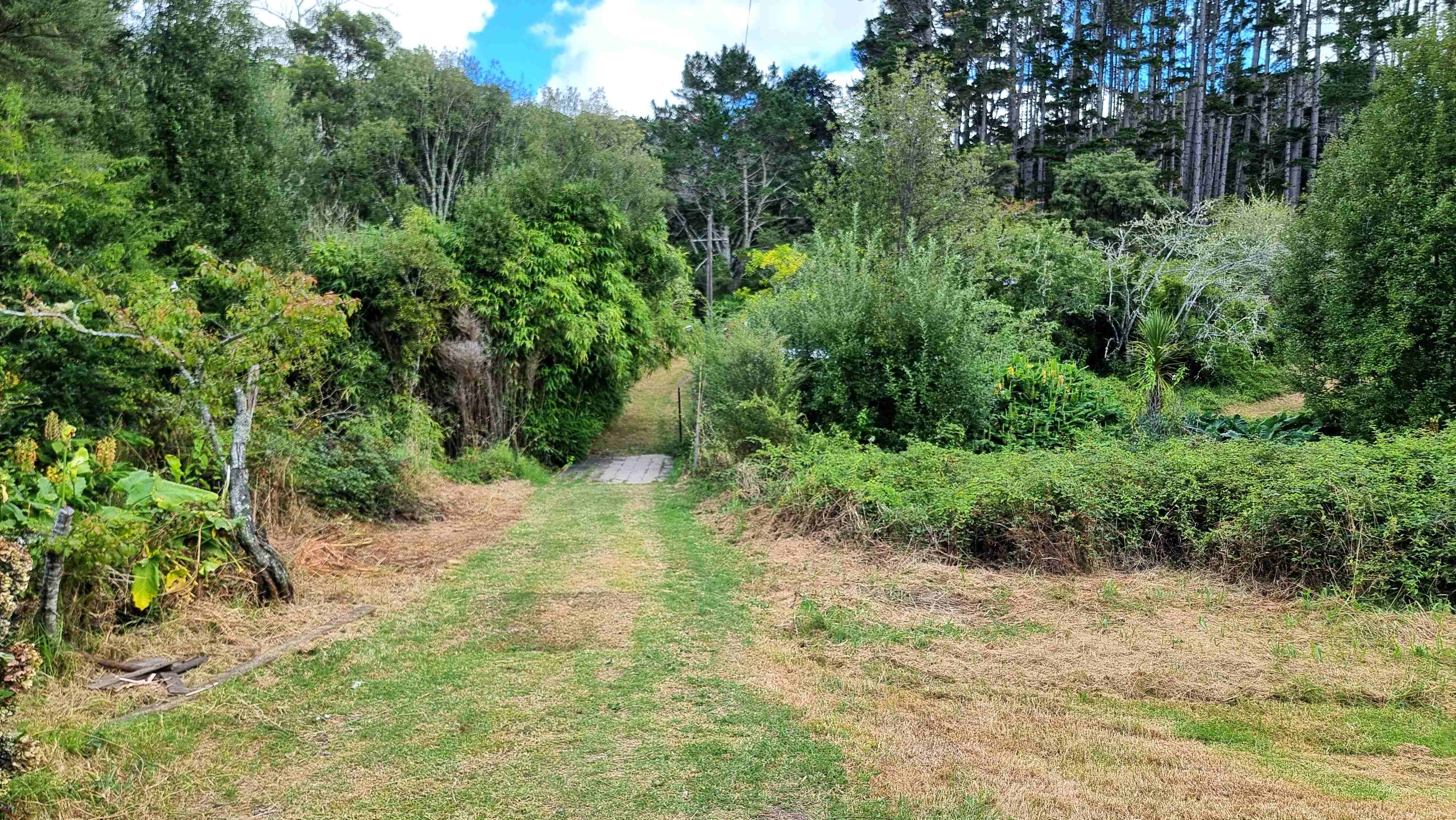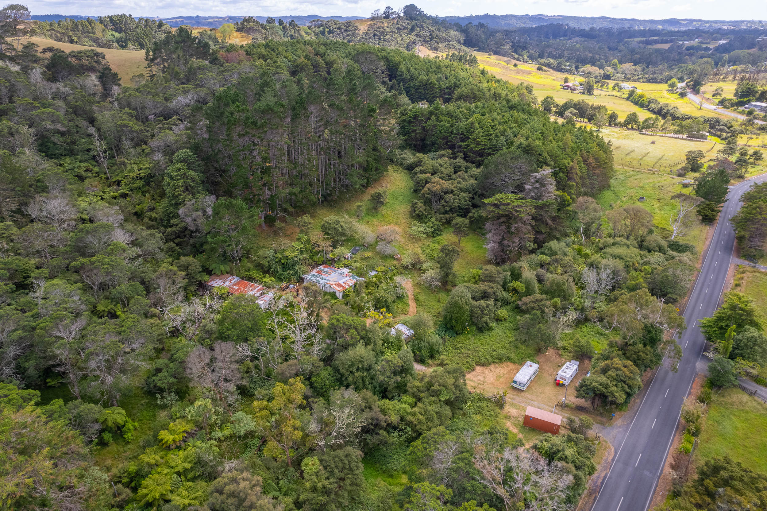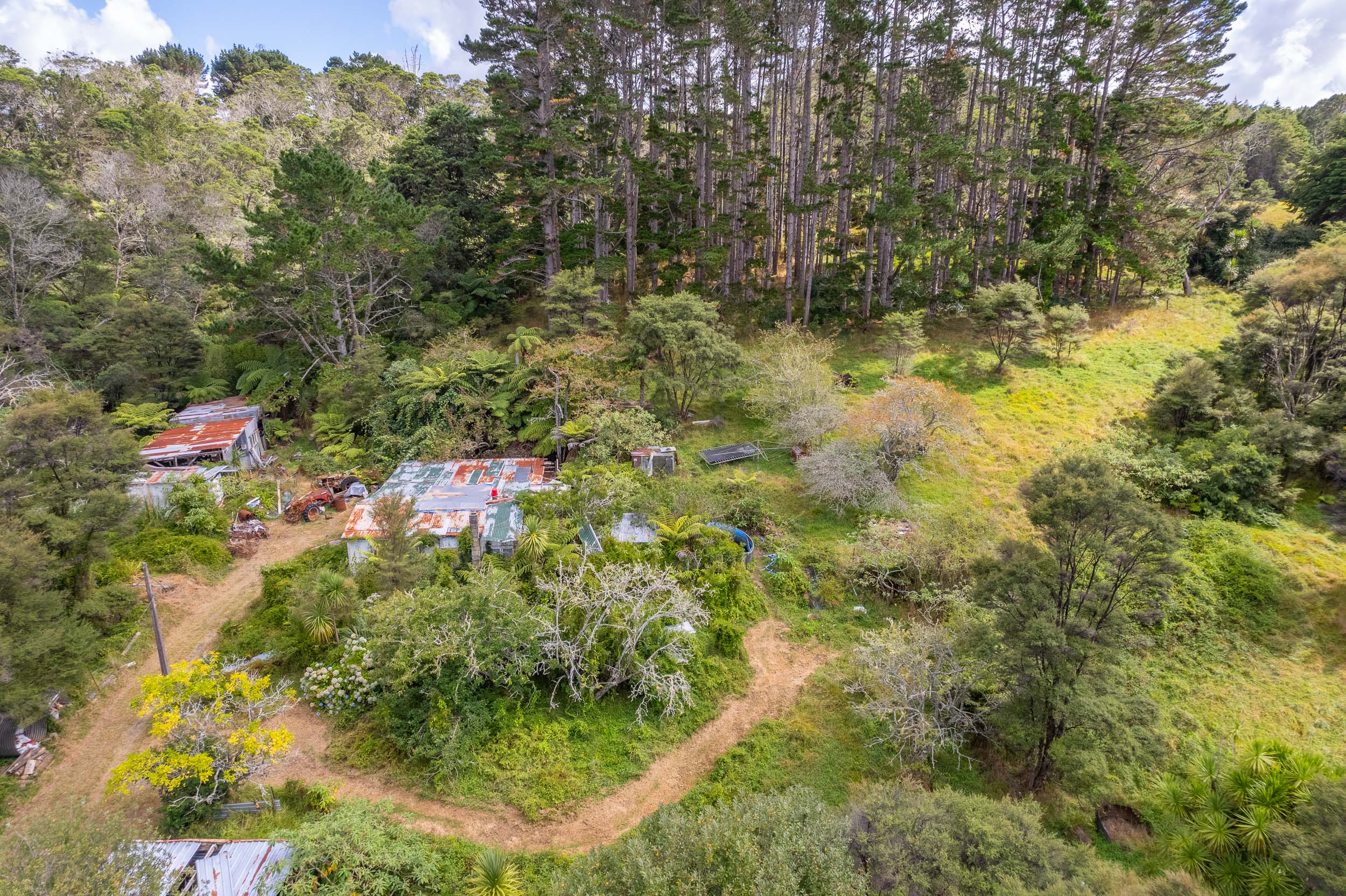 35-year-old extra-tall dead straight pine trees, stunning bush land and lots of clearings (which could be increased), a stream and spring with non-potable water and fruit trees scattered around the property including kiwifruit, Christmas plums, grapefruit, and apples.
