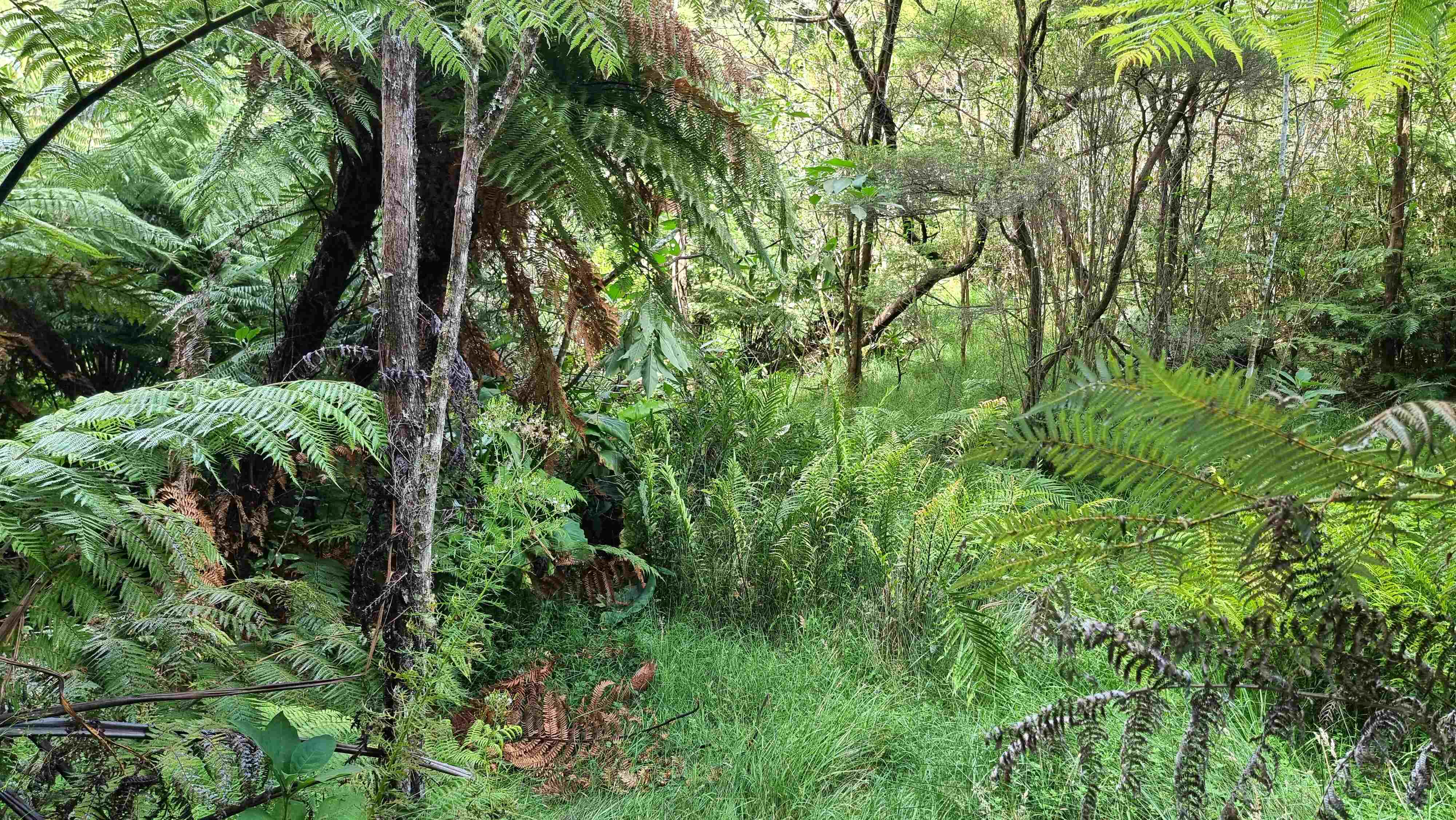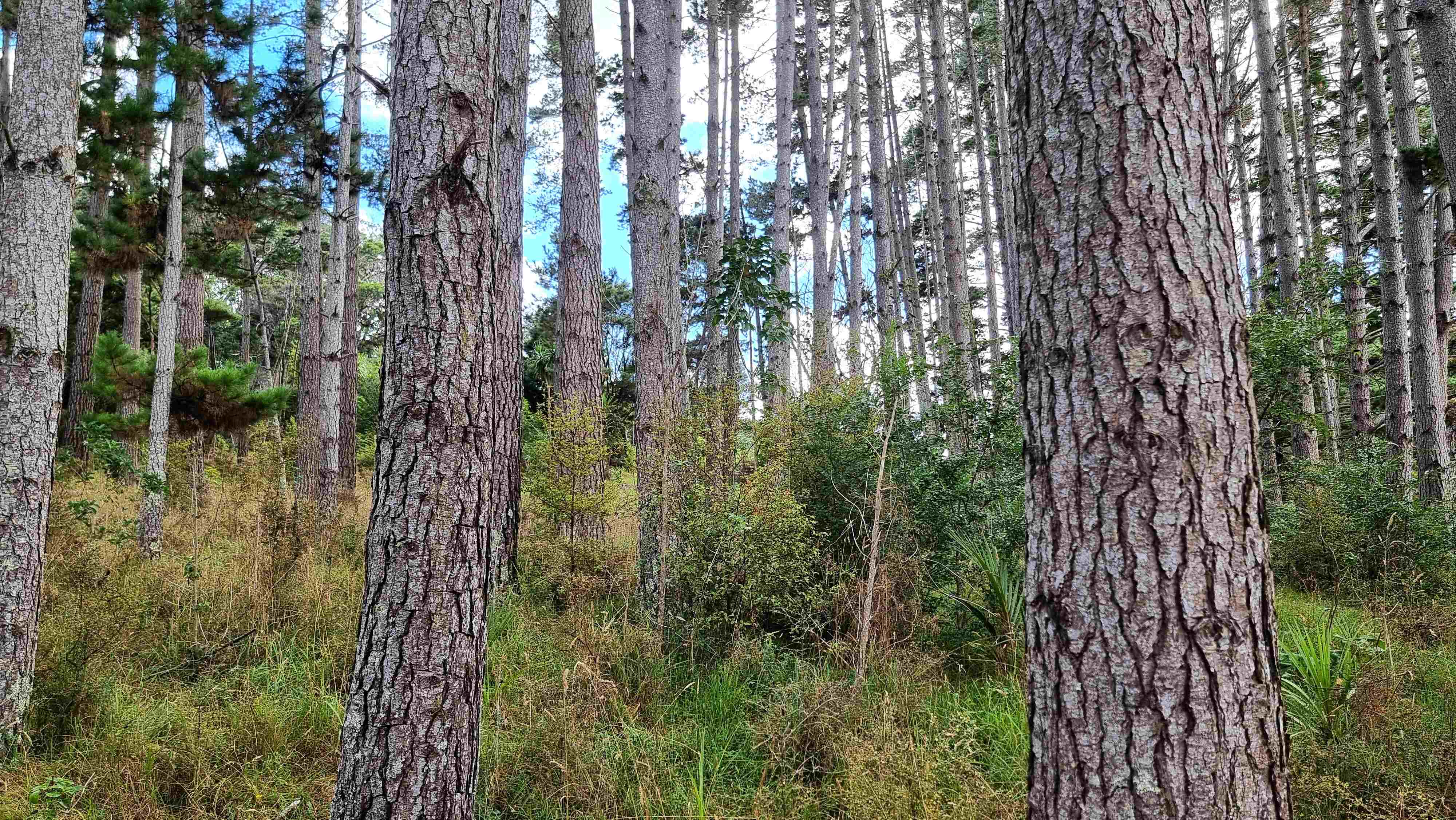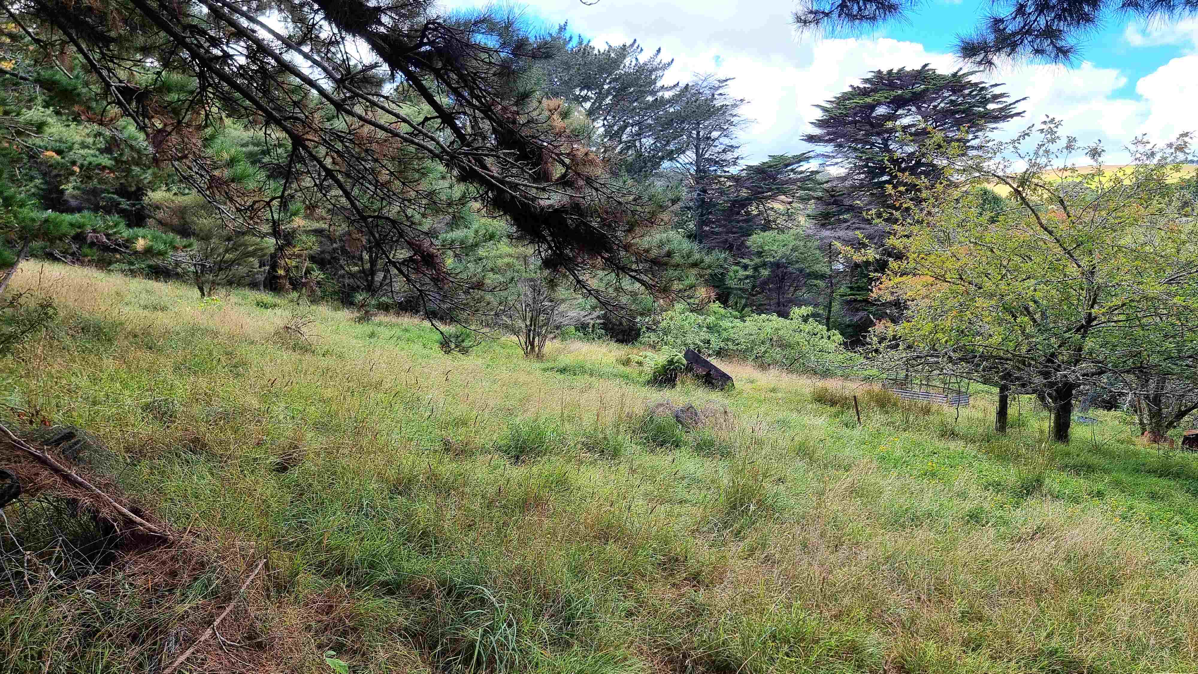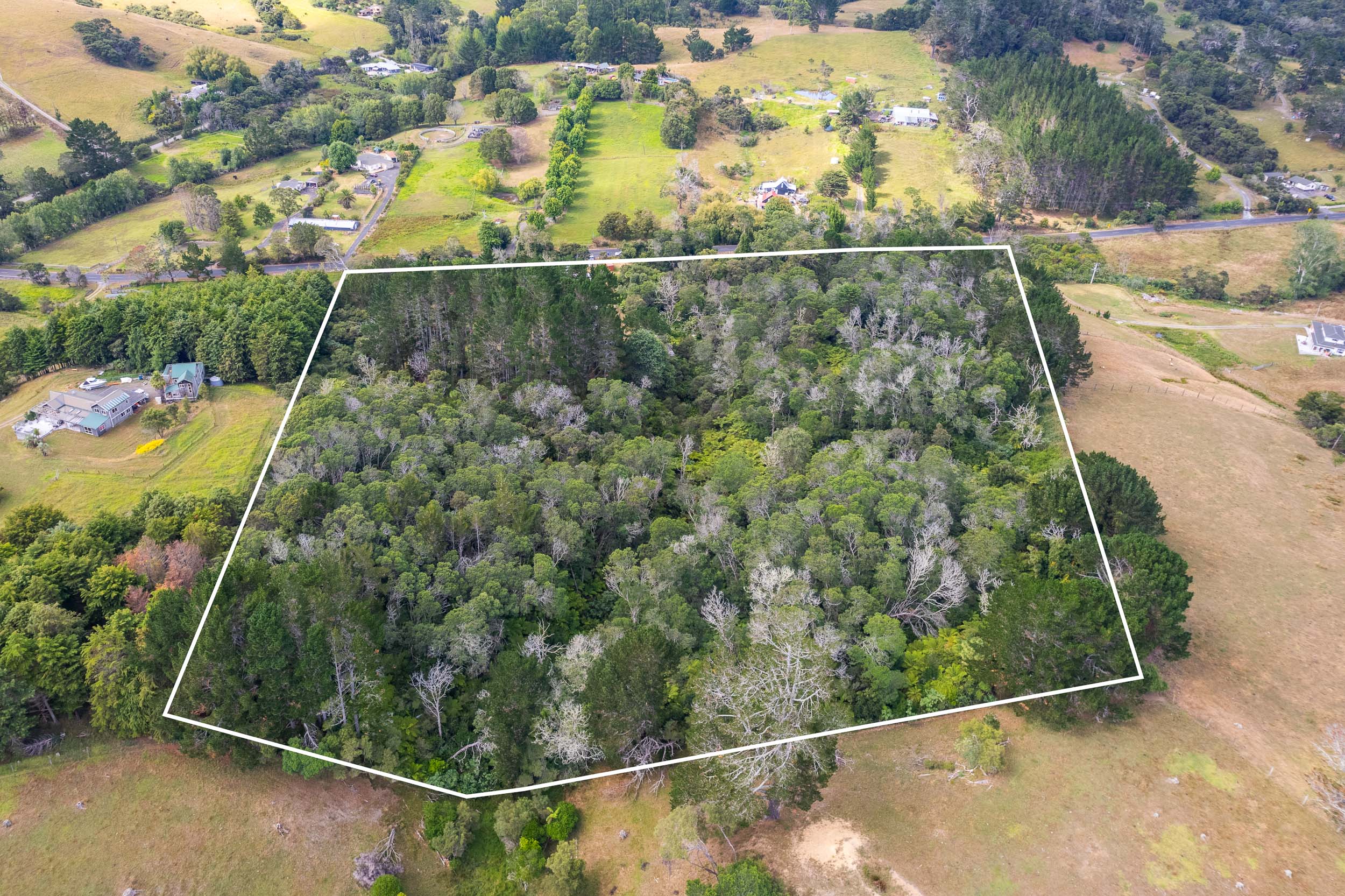 35-year-old extra-tall dead straight pine trees, stunning bush land and lots of clearings (which could be increased), a stream and spring with non-potable water and fruit trees scattered around the property including kiwifruit, Christmas plums, grapefruit, and apples.