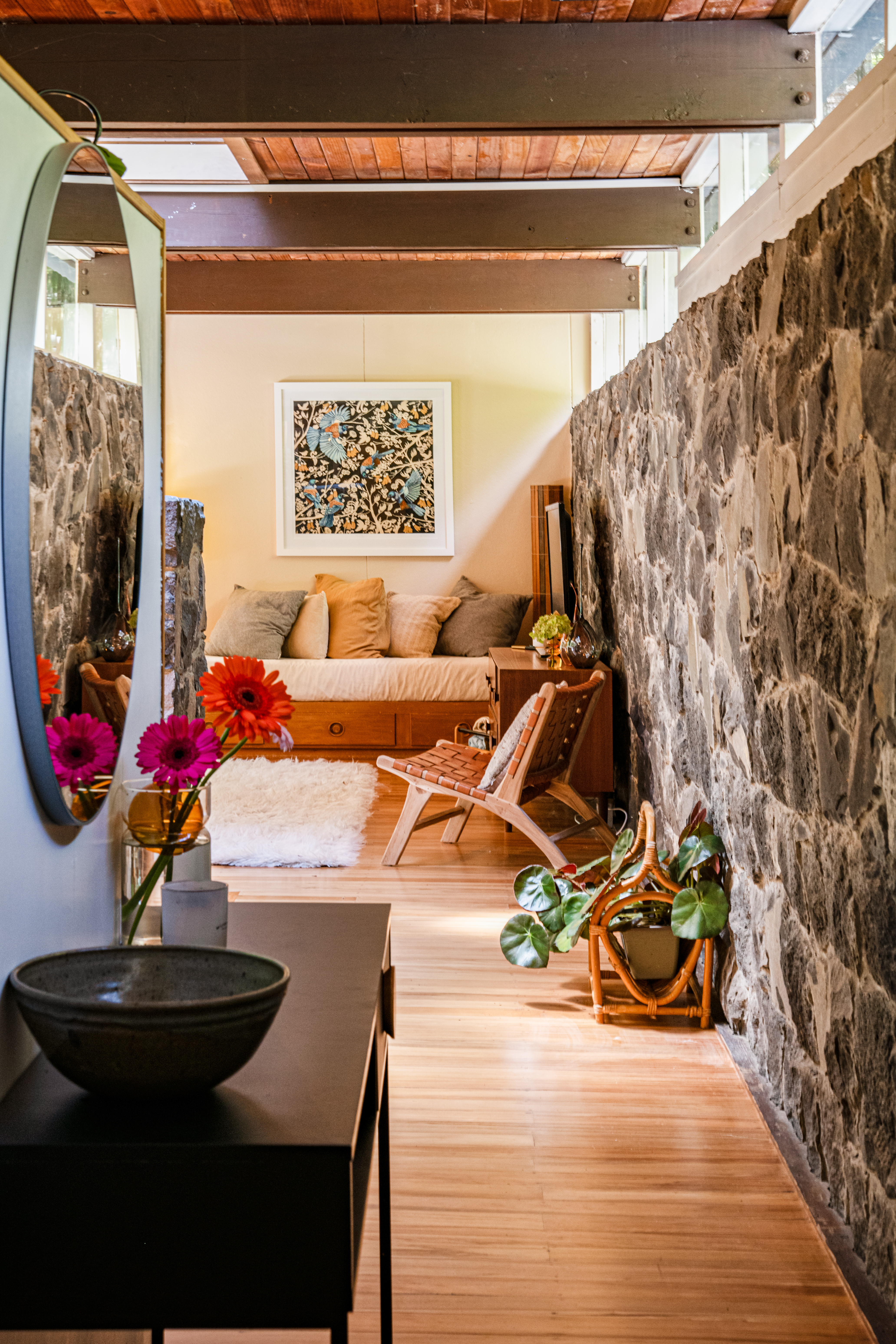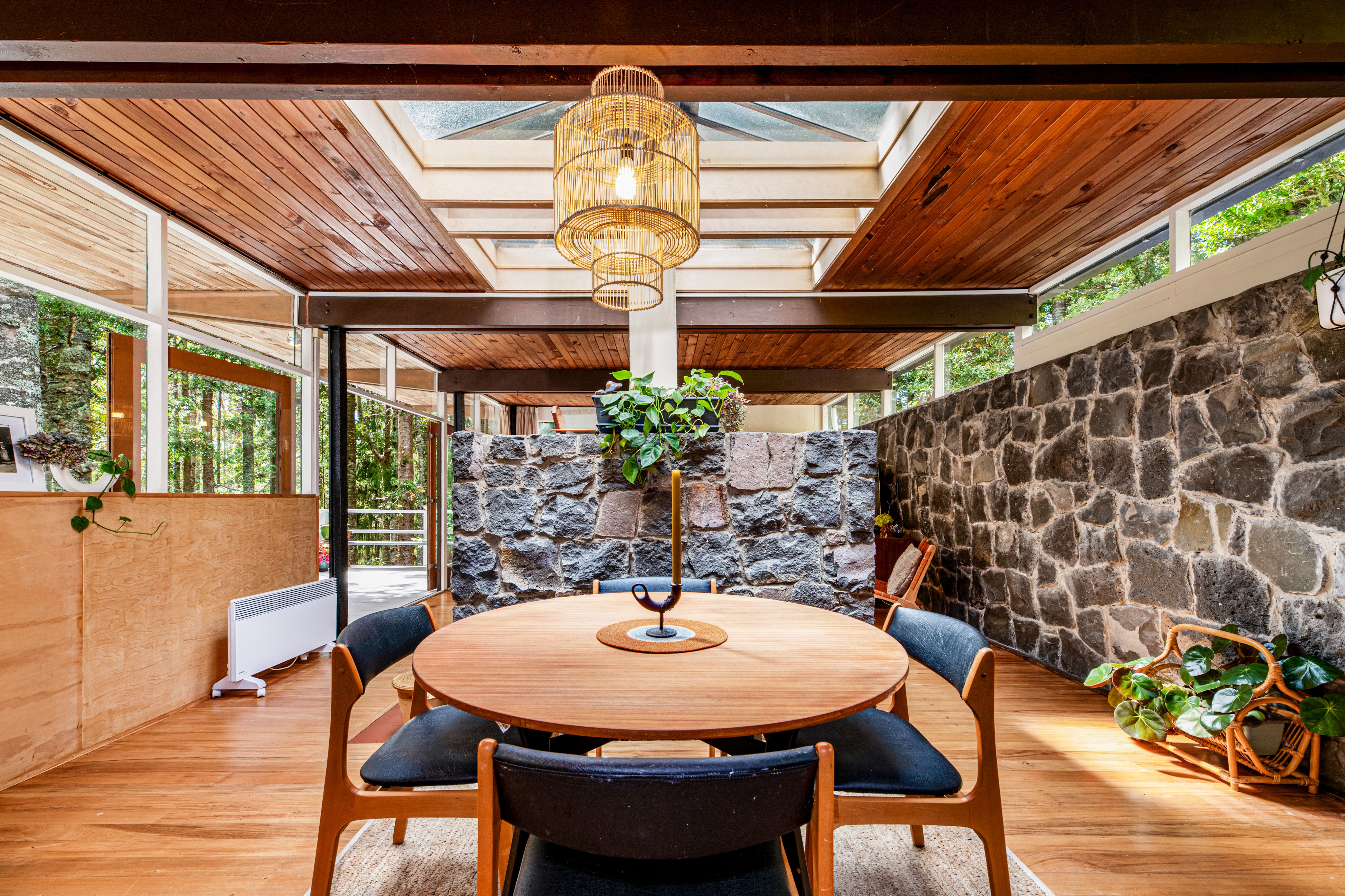The front door, not immediately visible is a secret passage to another world. Step into the open plan house and you realise you're floating in the dappled light of the forest, every window gifting an amazing view. Looking around and the house the view is mirrored - built in luxuriant wood, anchored in stone and heavy steel, its solid. It is art.