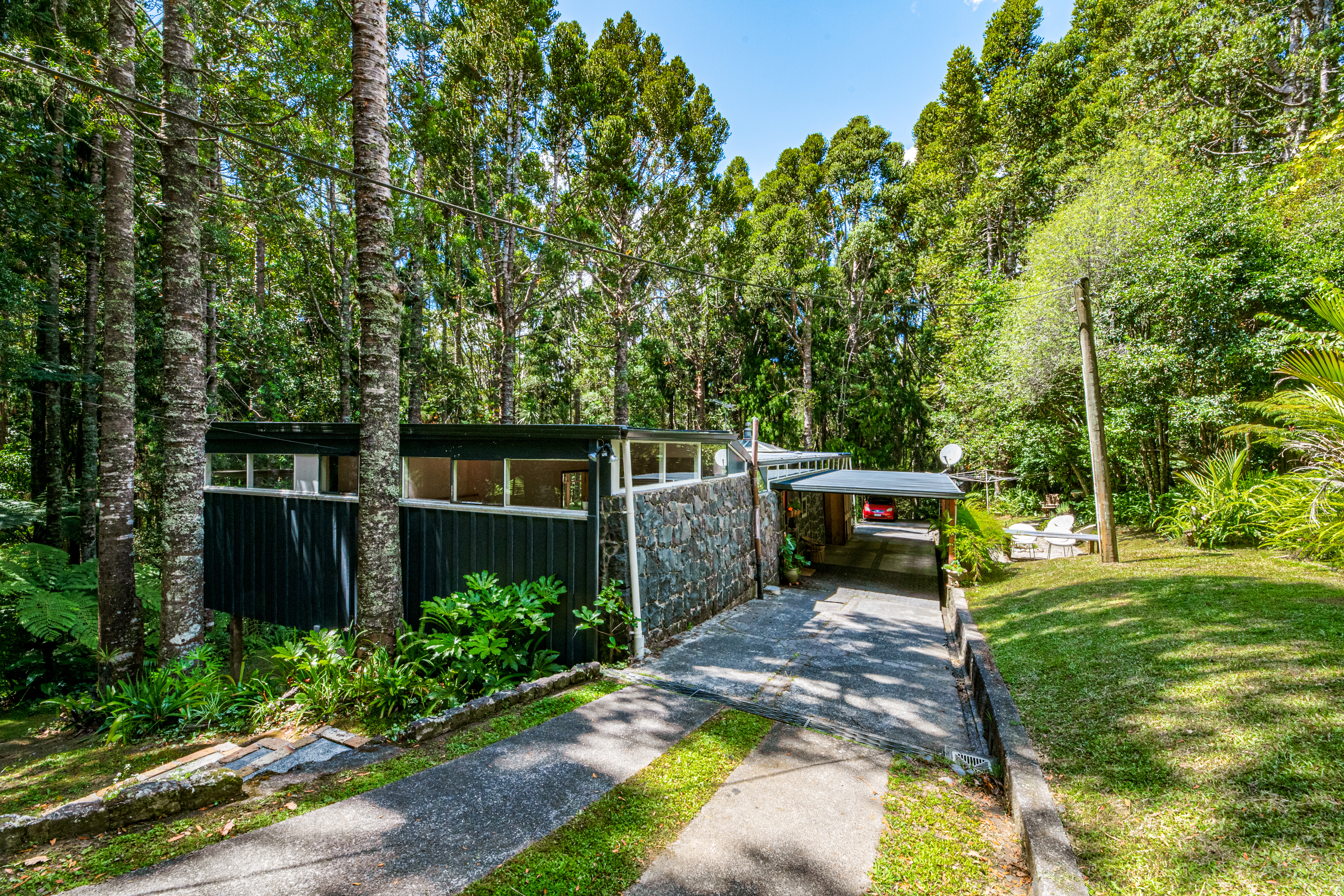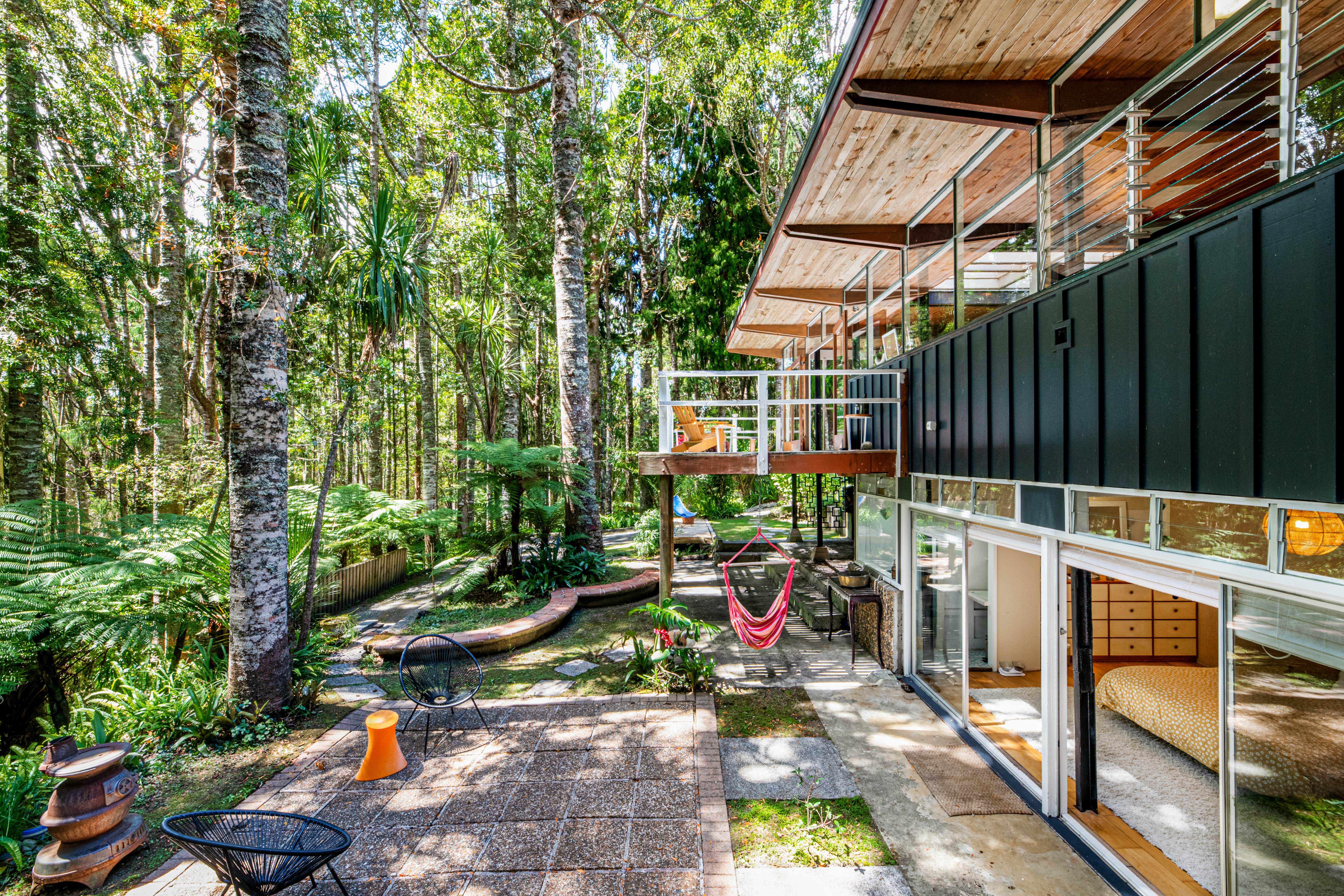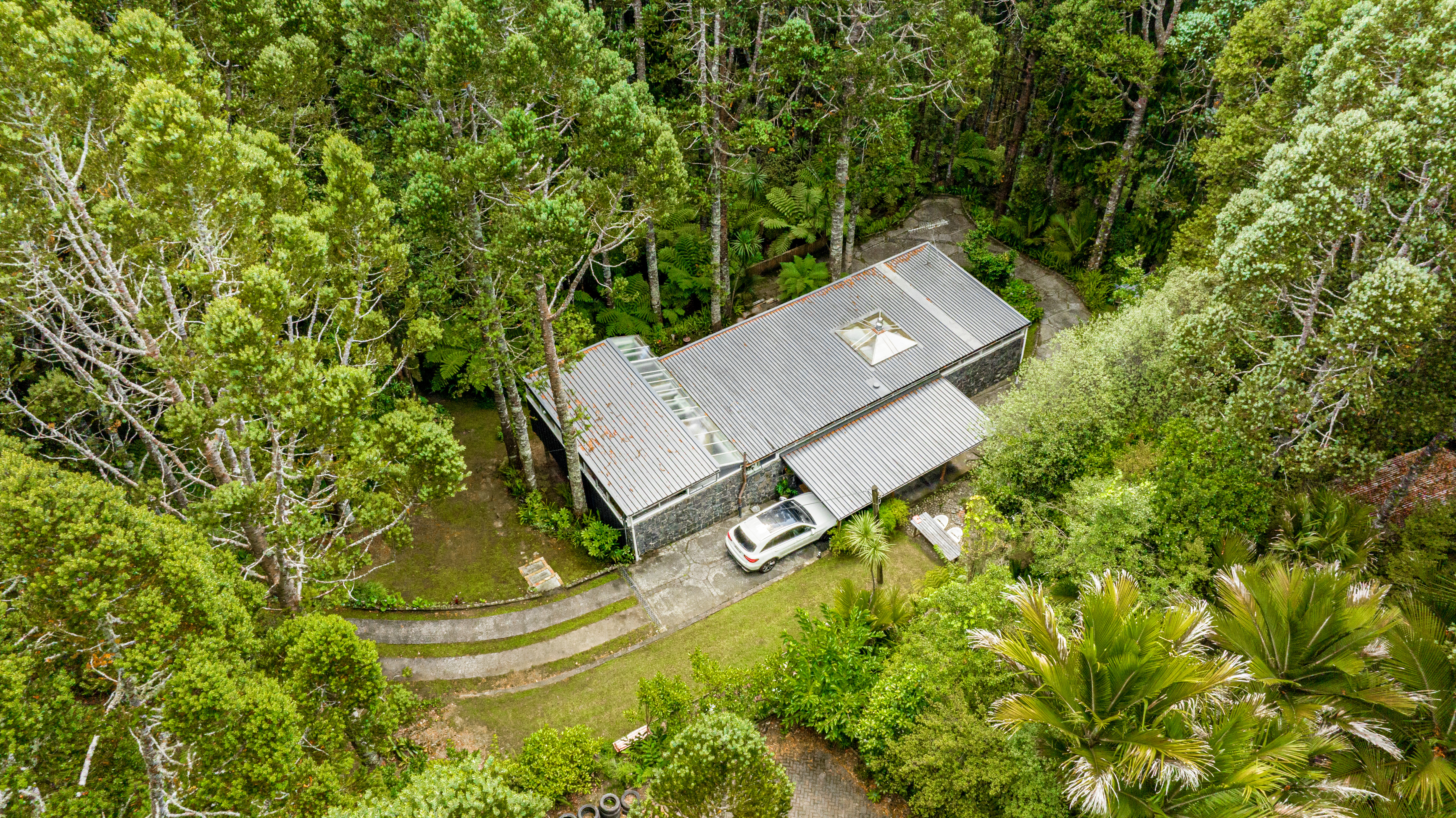 Take a moment at the top of the drive, stop. Listen to the birds, the cicadas, the rustling leaves. Smell the fresh earth, the trees. See a house like no other, poised amongst an astounding kauri forest.