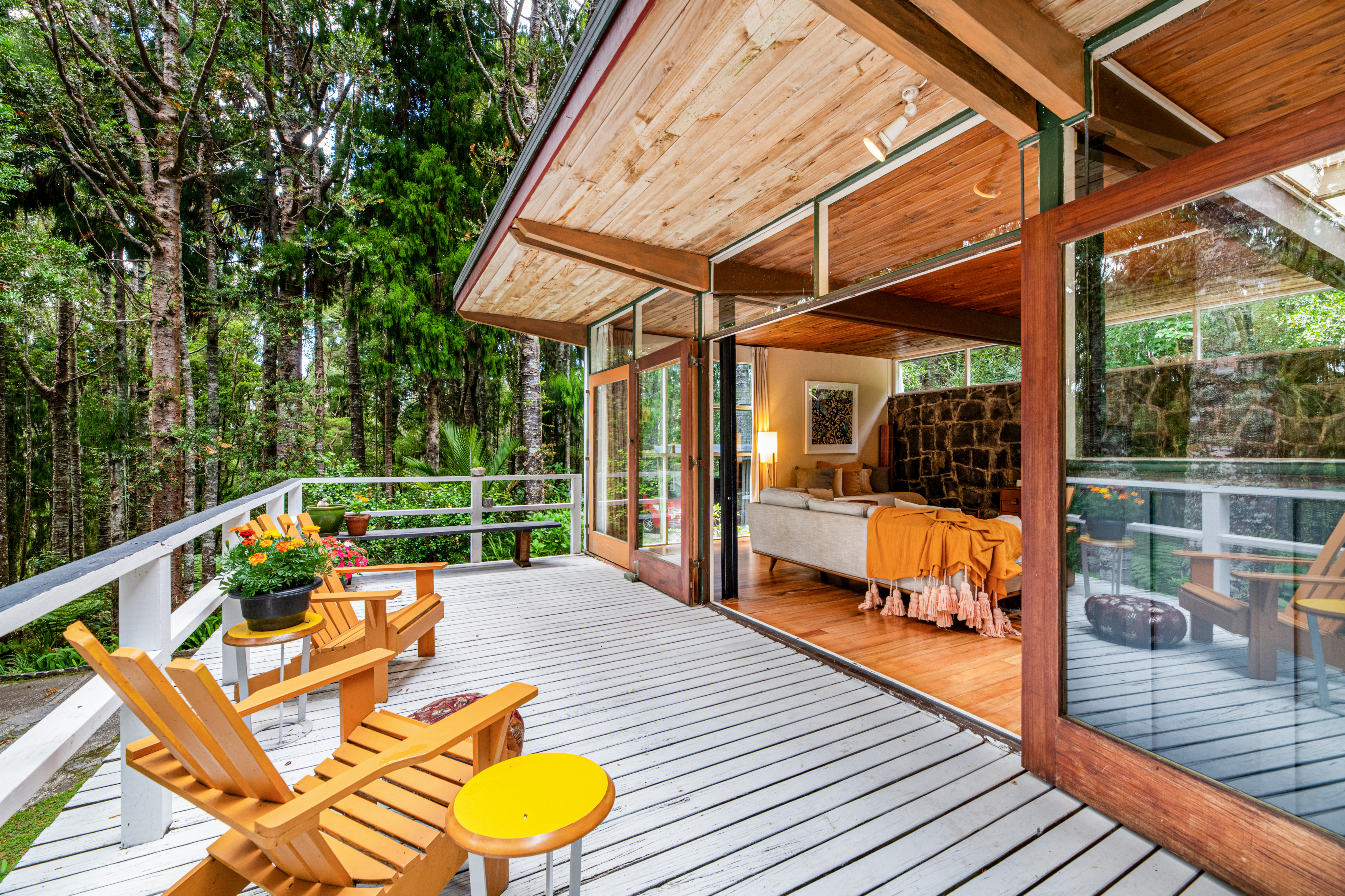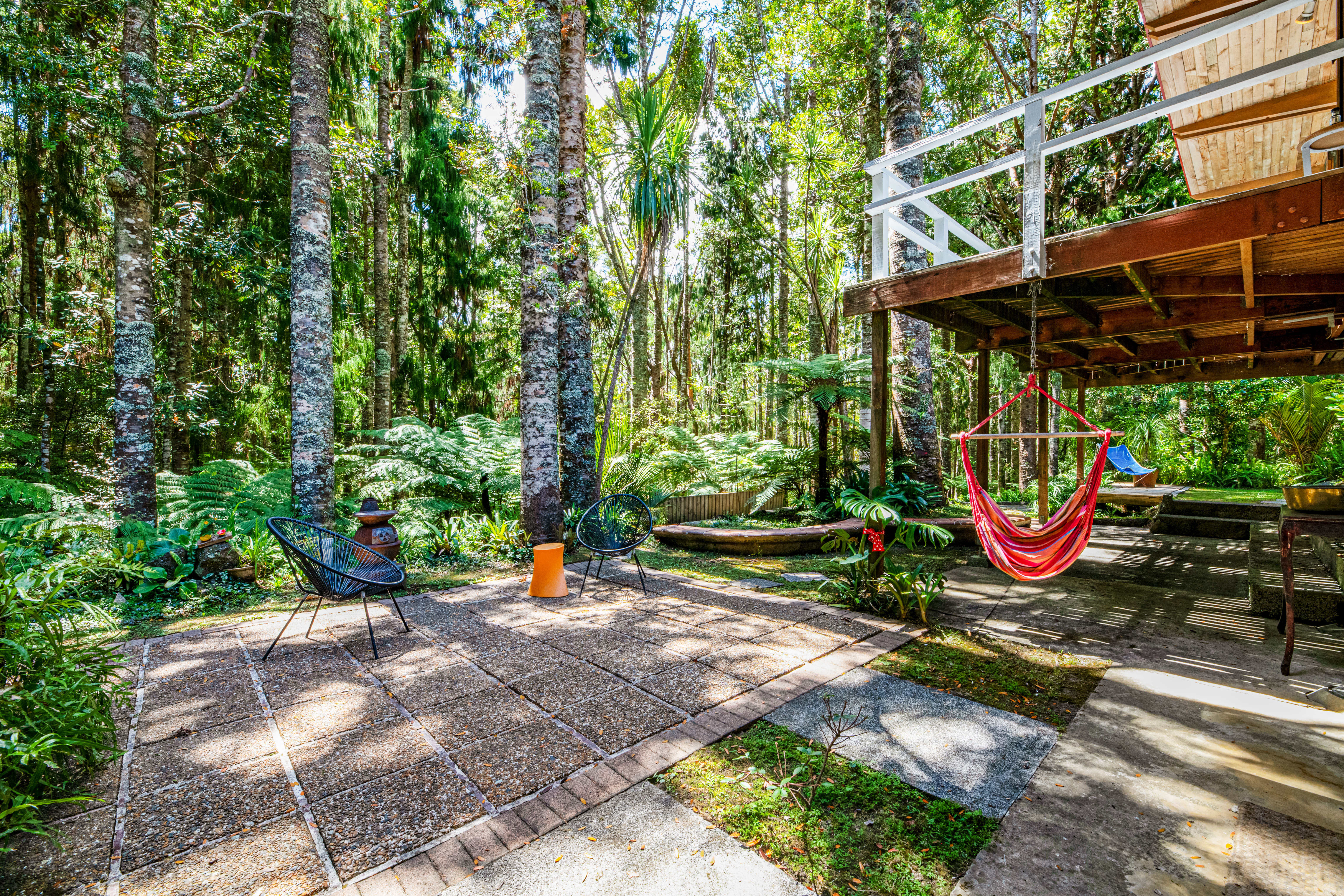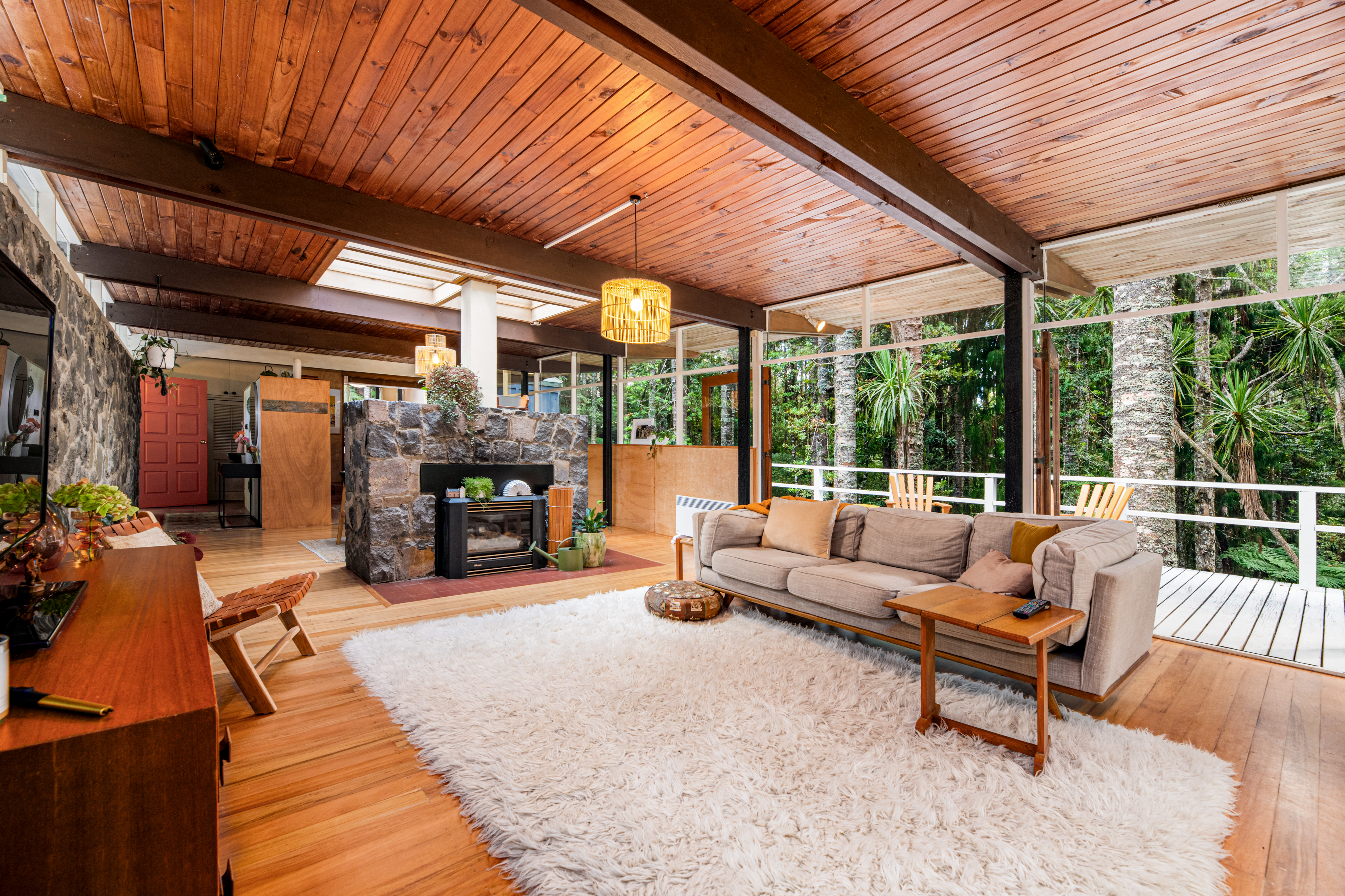 Take a moment at the top of the drive, stop. Listen to the birds, the cicadas, the rustling leaves. Smell the fresh earth, the trees. See a house like no other, poised amongst an astounding kauri forest.