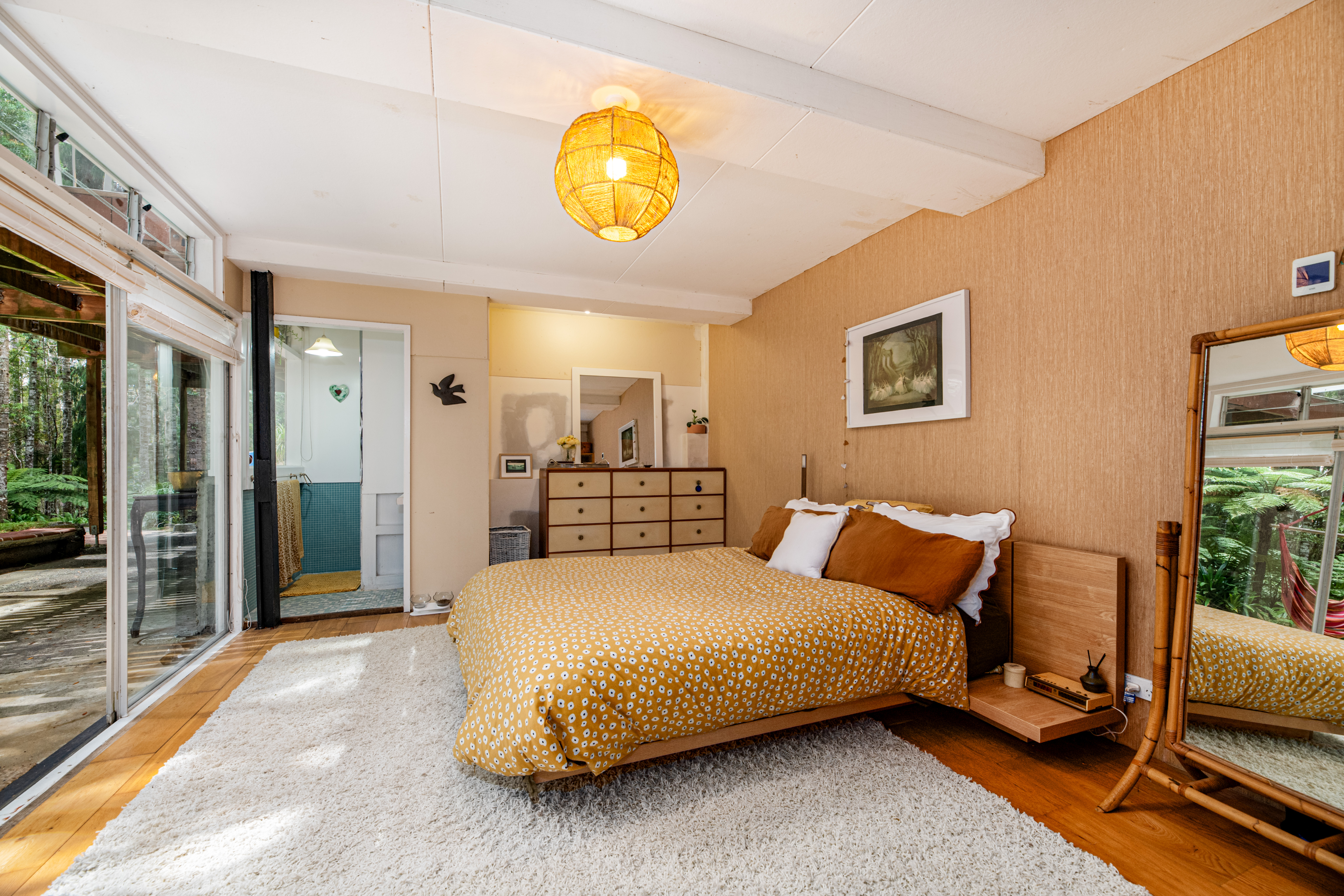 Downstairs and it's a different world again. Now you look up at the magnificent Kauri, reaching for the sky as they have for hundreds of years. The spacious bedroom with ½ bathroom opens onto a secluded patio, where time stands still. Your very own sanctuary surrounded by New Zealand nature at its very best.