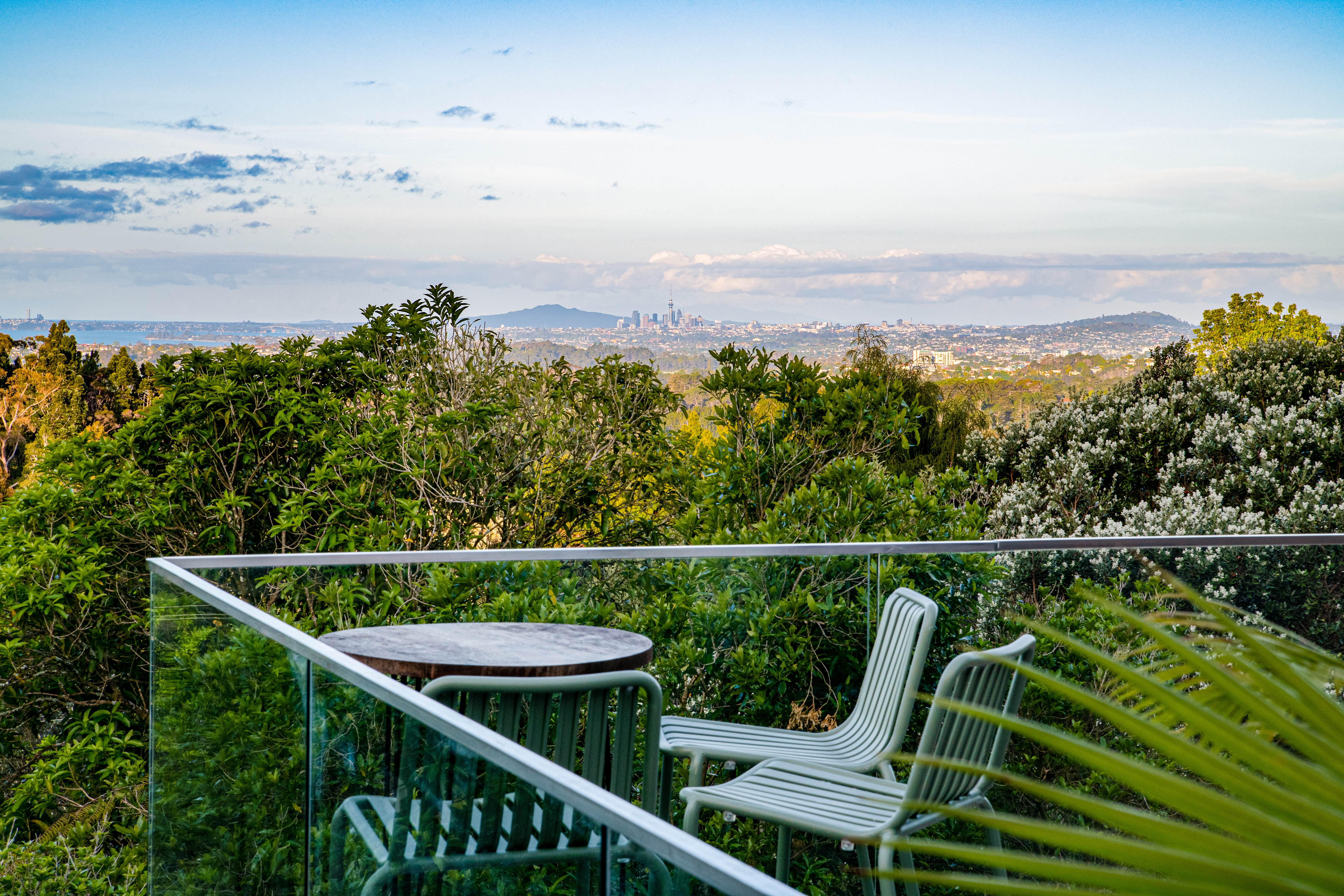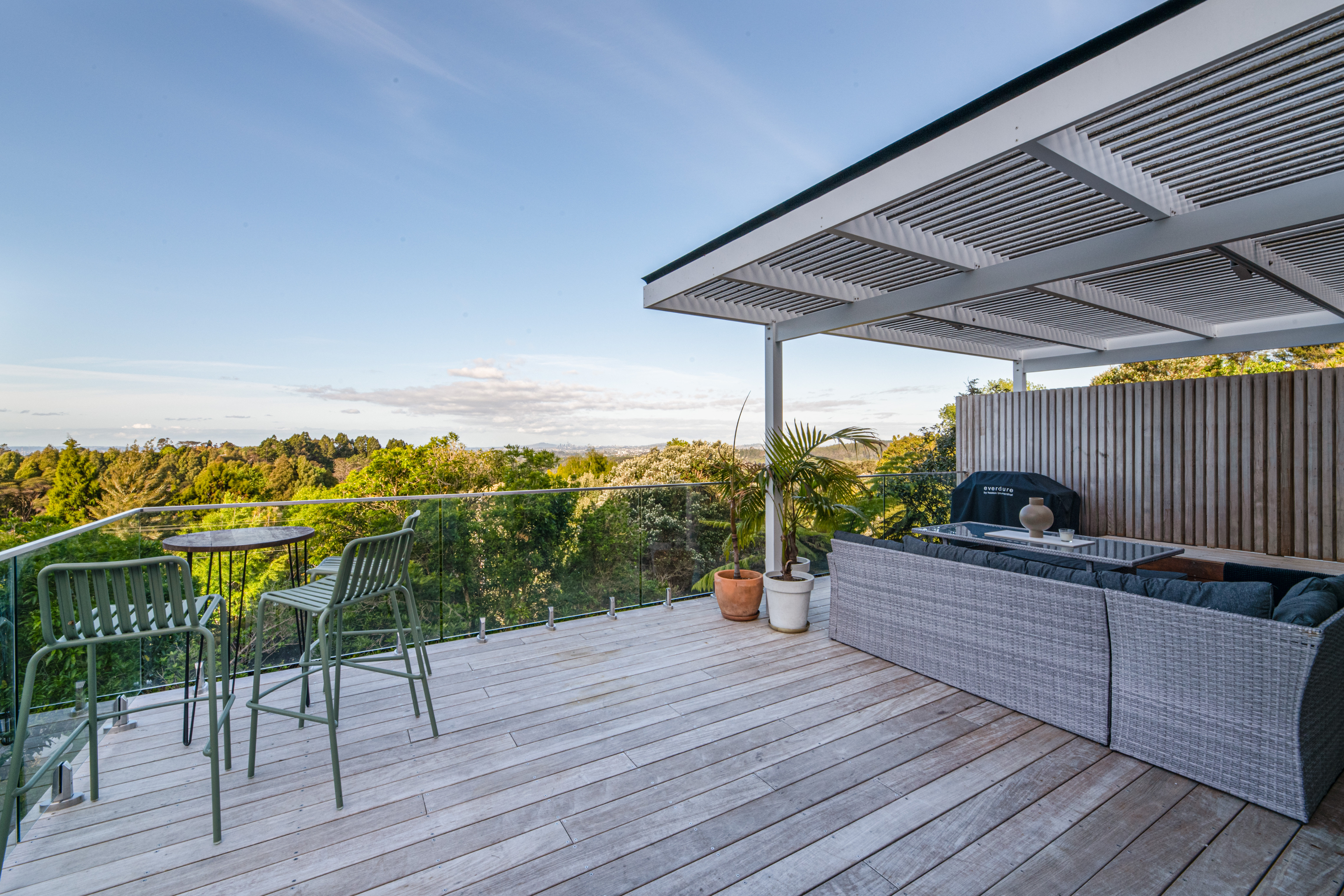 Step inside and you'll find generous living spaces that seamlessly connect to an expansive deck via large stacking doors. Enjoy breathtaking vistas of the city and Rangitoto, or host memorable gatherings surrounded by native bush. The north-facing design ensures an abundance of natural light, complemented by a louvre roof system for year-round outdoor enjoyment, rain or shine.
