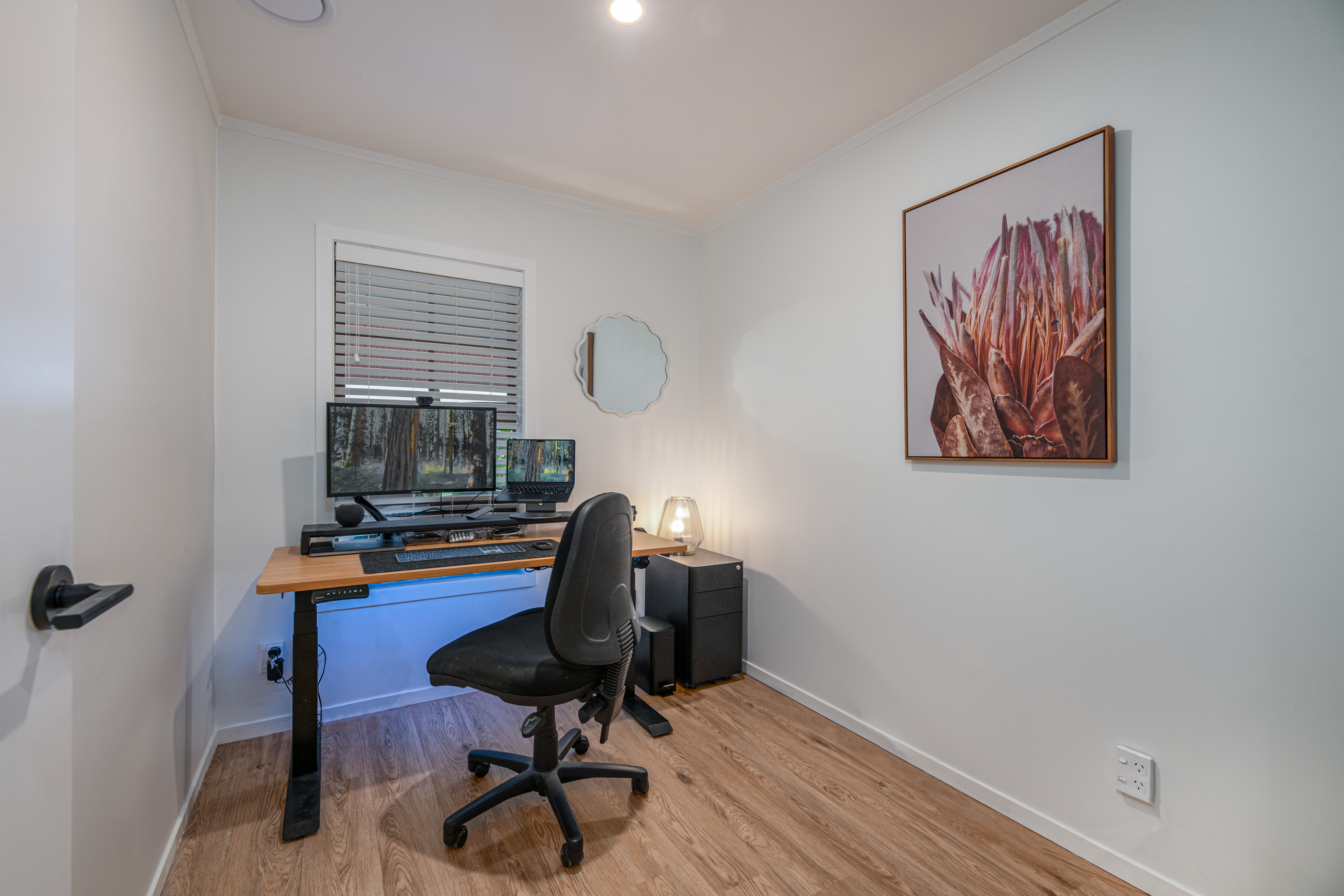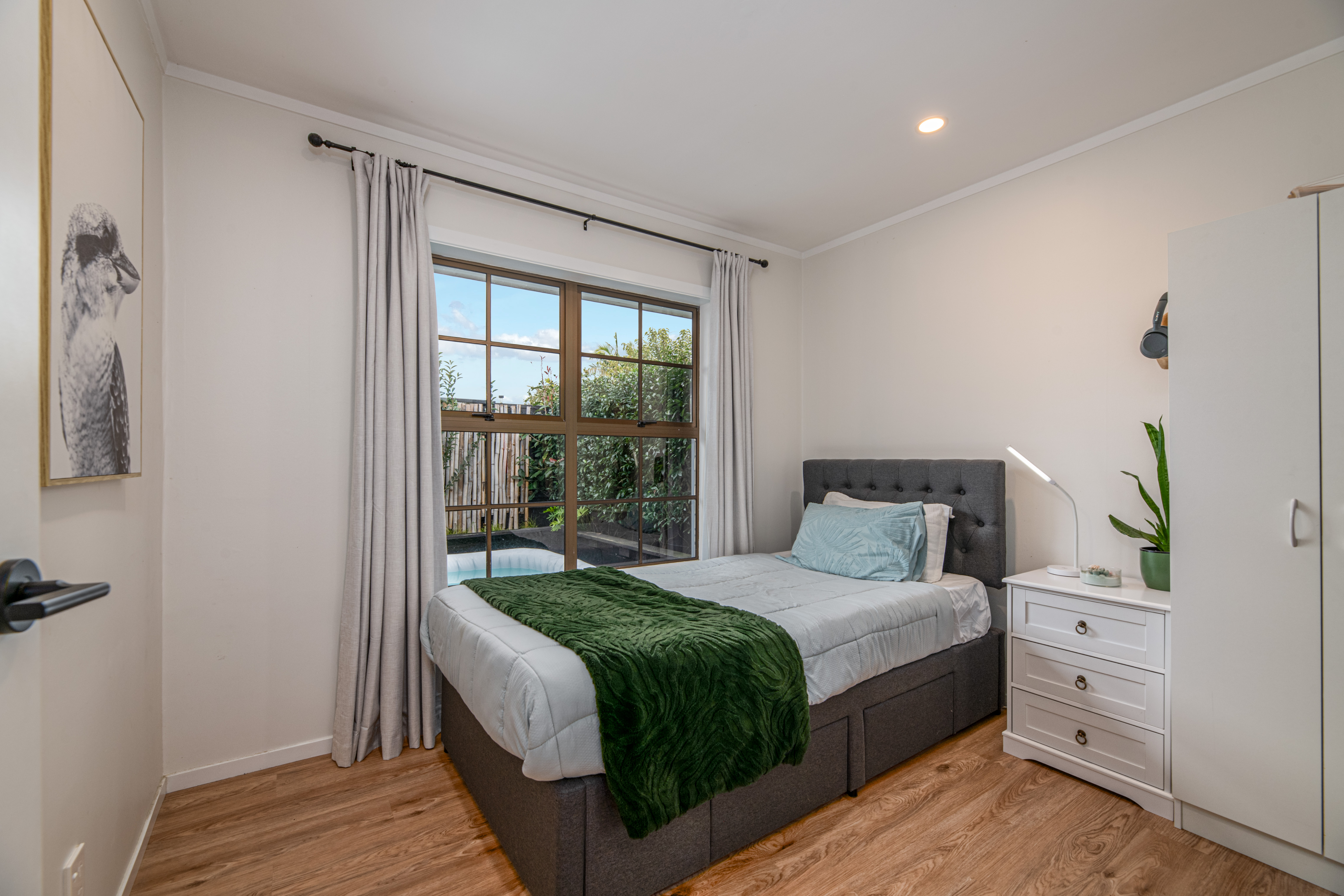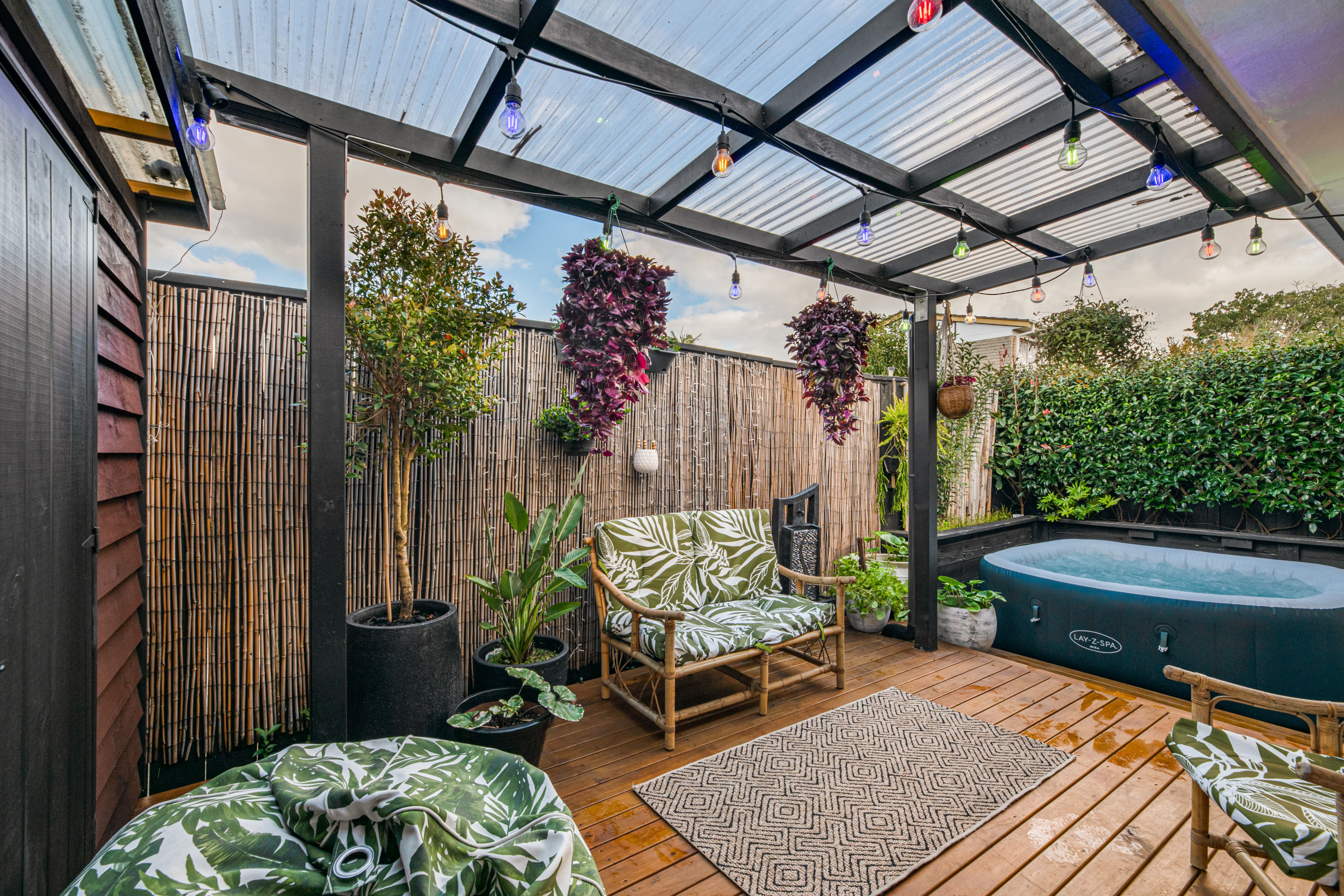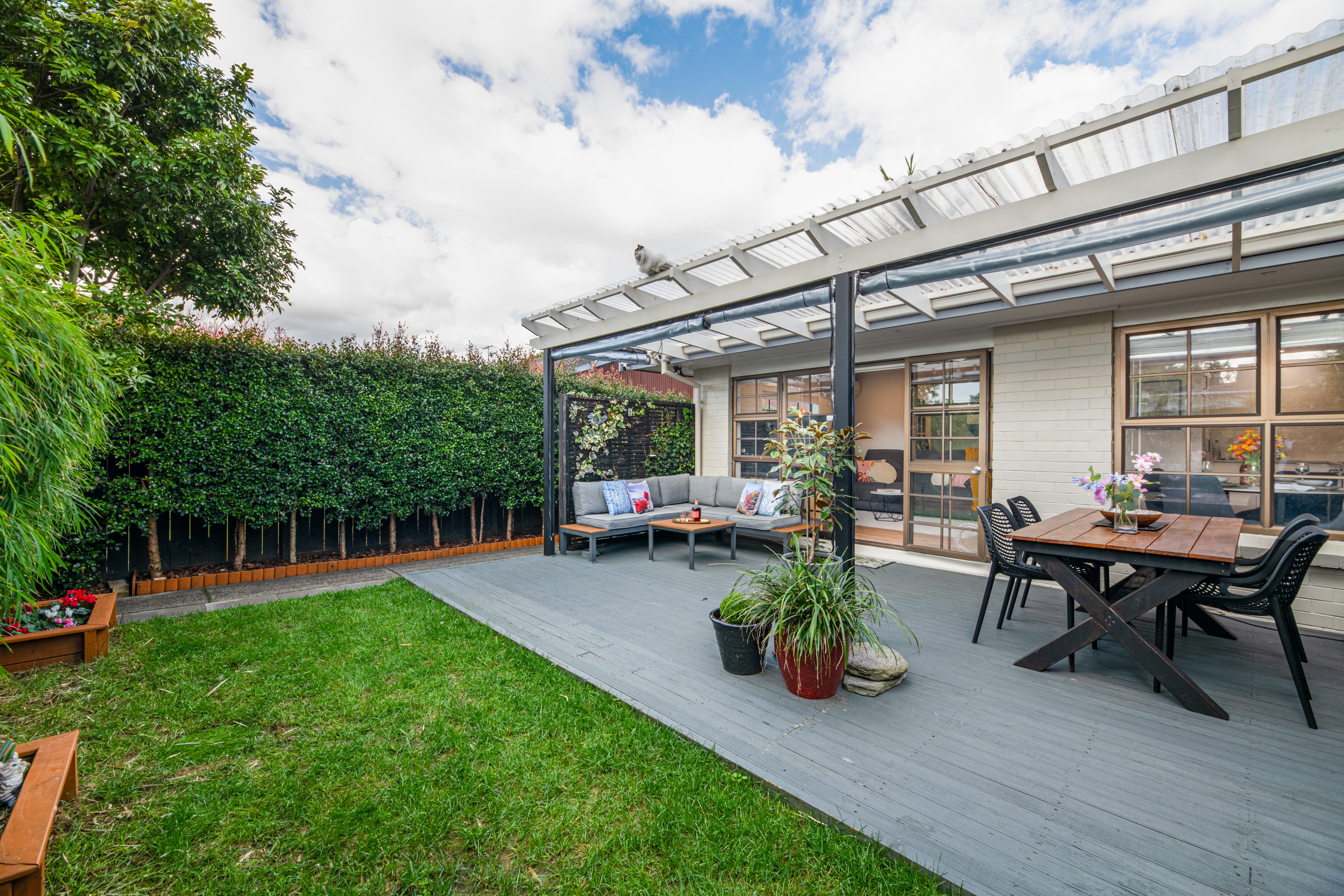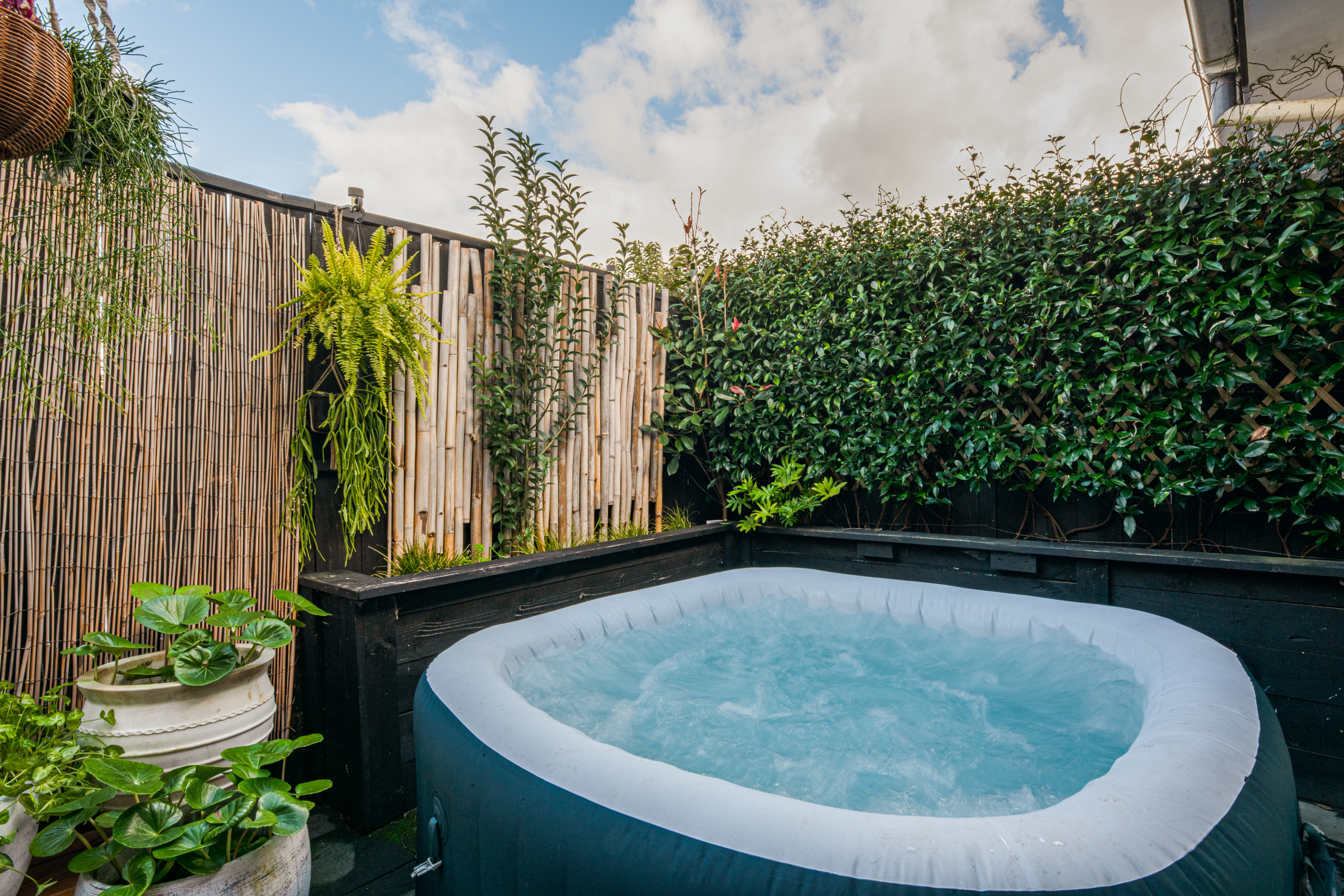 Fully fenced and surrounded by established, easy care gardens, the outdoor spaces include a sunny, north-facing courtyard at the front and a quiet garden with spa pool at the rear.