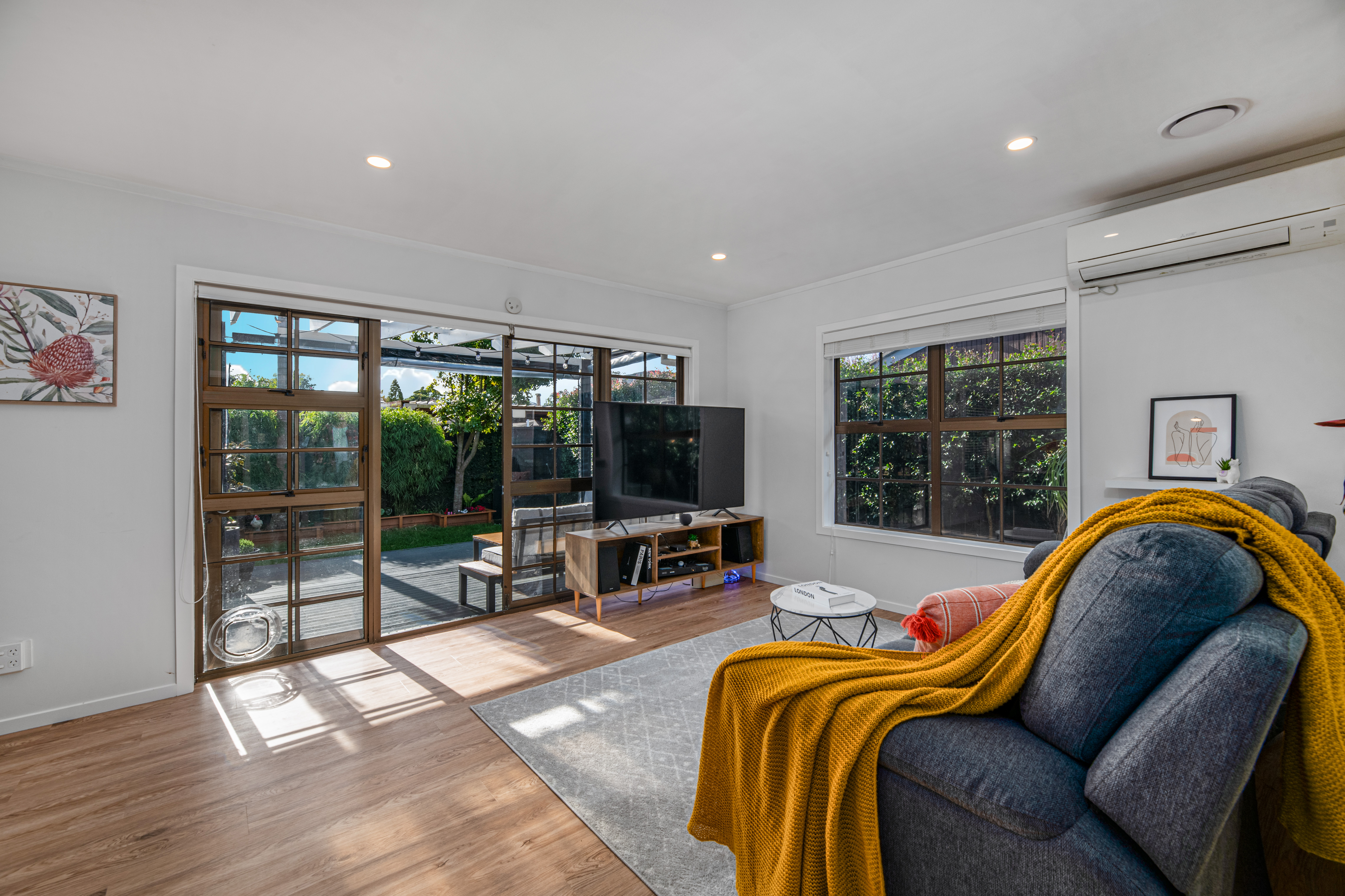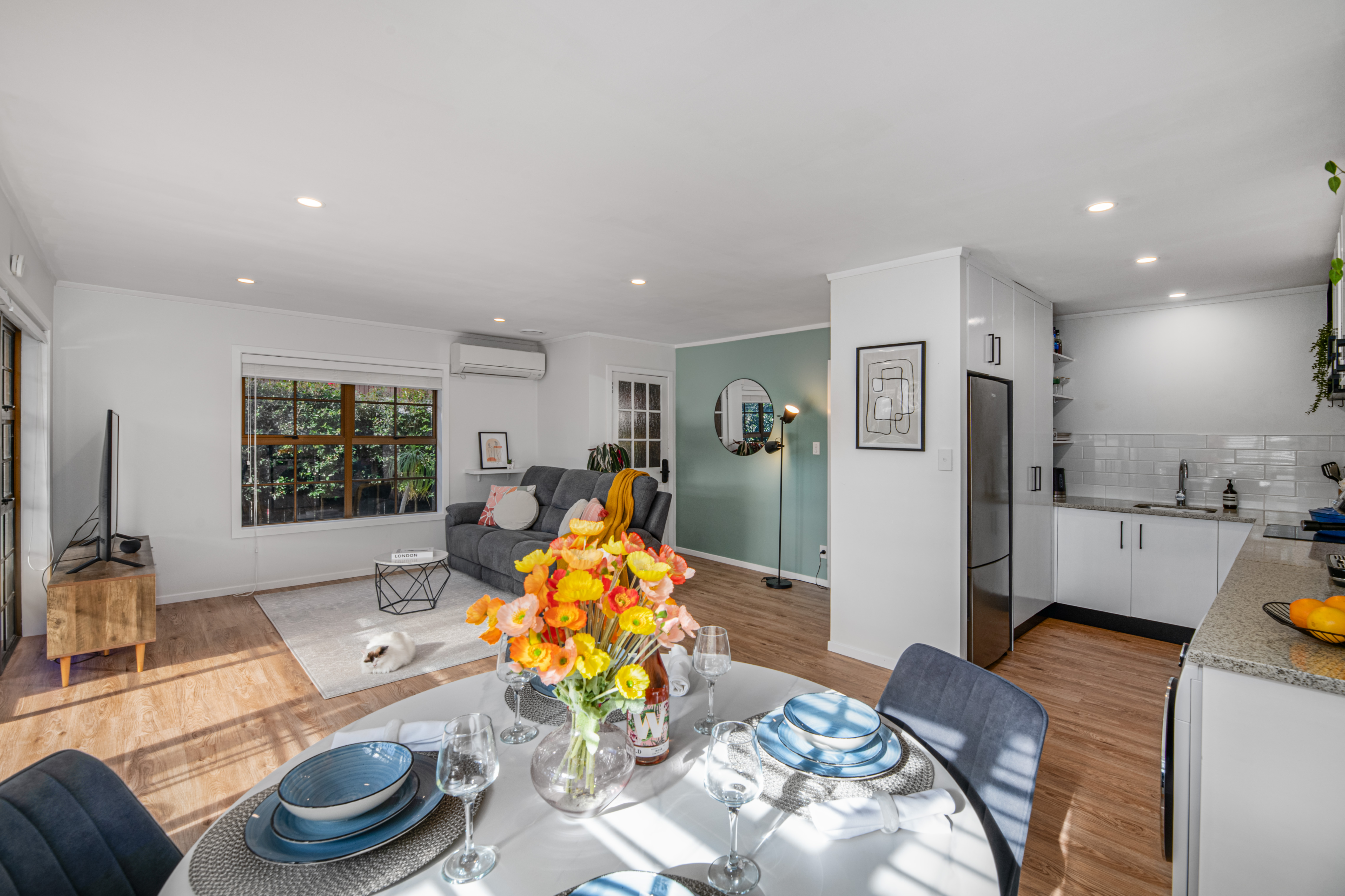 The open-plan kitchen, dining, and living area flows directly to the courtyard. The kitchen has an induction cooktop and quality appliances. Modern laminate flooring, LED lighting, insulation, and a heat pump ensure comfort year-round. Gas infinity hot water adds efficiency.