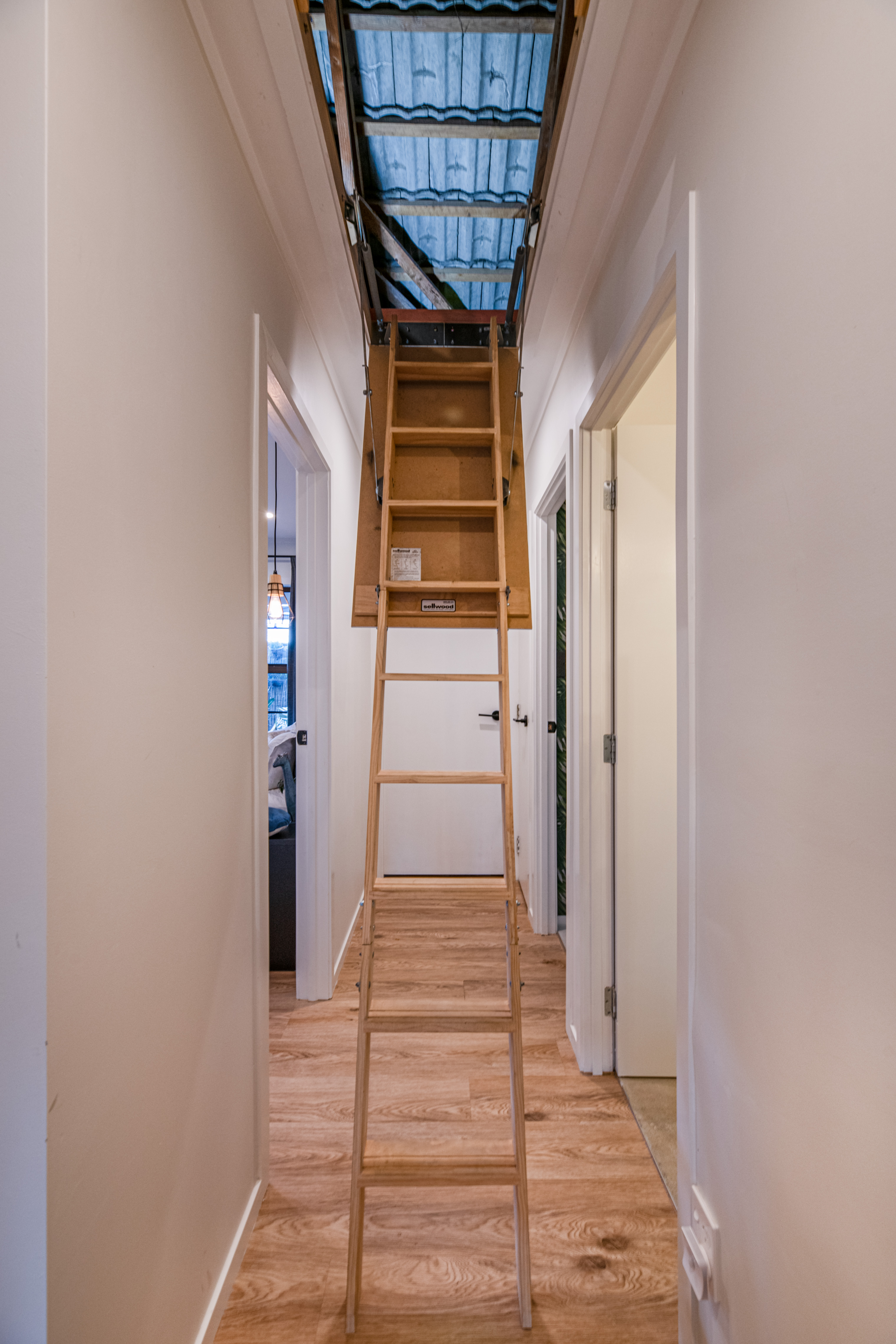 Inside, the home has been tastefully renovated for modern, low-maintenance living. It features two bedrooms, a dedicated office or nursery, and a large attic with built-in ladder for extra storage. The bathroom includes underfloor heating, a walk-in shower, skylight, and a separate toilet.